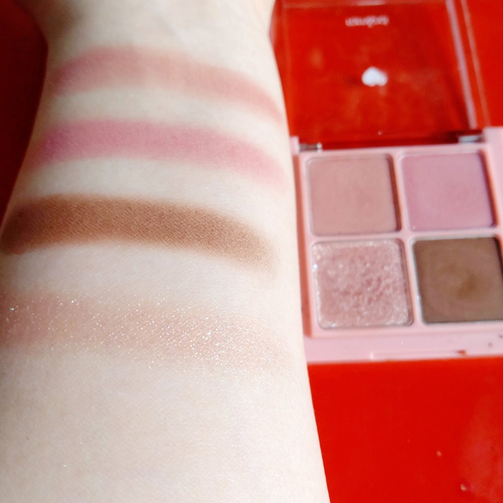 プチプラのクオリティじゃないっ!! 発売前からチェックしていたけれど、ここまで可愛いとは…😆 絶妙カラーで目もとのくすみを飛ばして*明るい印象に🩷 横割りグラデーションでメイクし、立体感をより出したかったので最後に1番左のカラーを上まぶたの真ん中と涙袋にのせています🙆 肌馴染みも良くて粉飛びも感じにくかったです💕 ブラウンの方も店頭に出てたら買おうかな💓