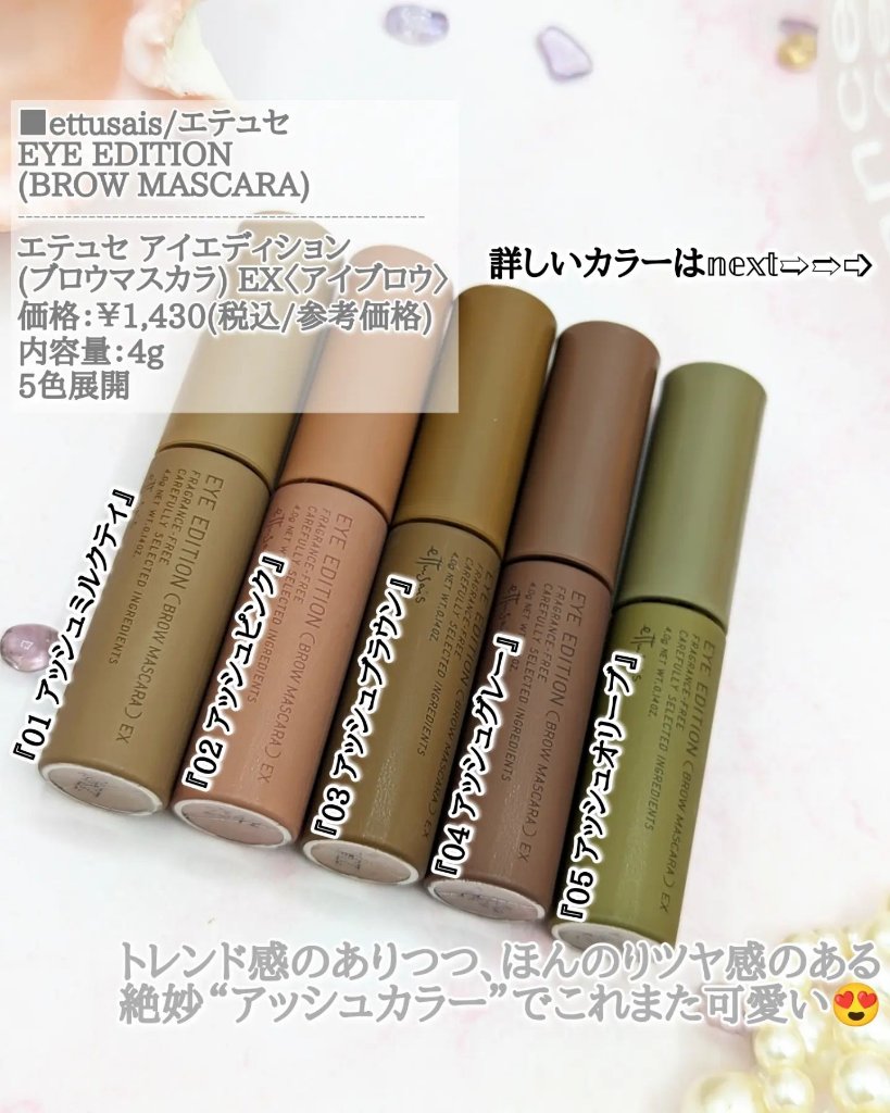 - 毛流れ感じるツヤ質感。極小*カーブブラシで失敗しにくい。 アッシュ系ニュアンスカラーの眉マスカラ。 *エテュセ内 〇ツヤのあるアッシュカラーで眉毛の色を自然にカラーリング。 ー透明感と柔らかさを演出するアッシュパール配合。 〇毛流れを出してしっかりキープするのに、ごわつきのない感触。 〇眉毛に塗りやすく、地肌に液がつきにくい「極小*カーブブラシ」採用。 *エテュセ内 〇ウォータープルーフ 〇汗・皮脂・こすれに強く、つけたての仕上りが長時間持続。 〇美容液成分配合 ー毛髪トリートメント(アミノ酸成分)、毛髪保湿成分(ヒアルロン酸)配合 〇無香料 〇アレルギーテスト済み (すべての方にアレルギーが起きないというわけではありません)