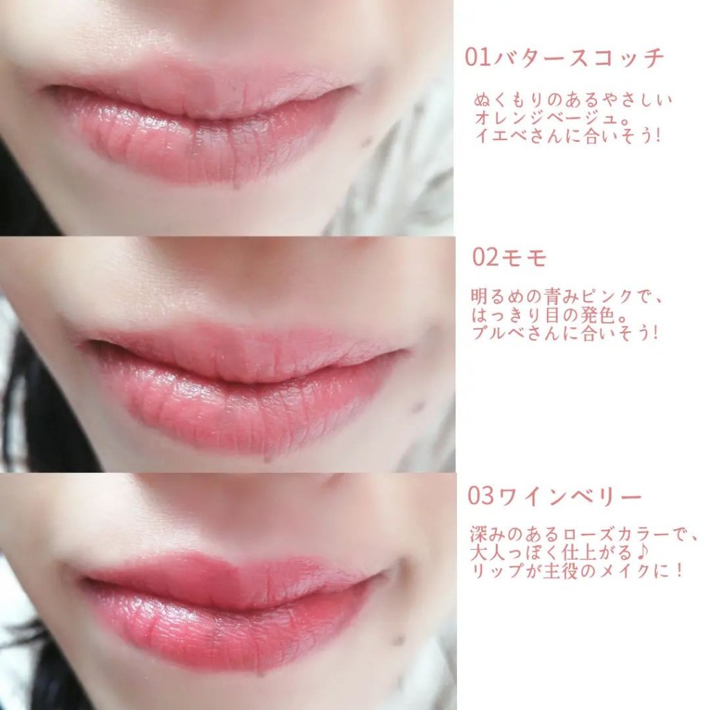 とっても柔らかいリップクリームで、まるで唇に溶け込むよう! 発色はナチュラルで、唇がきれいに色づいてくれます。 ツヤ感も出るので、ちょっとそこまでの外出やお家で過ごすときのナチュラルメイクにも◎ 色展開も豊富なので、気分に合わせたり普段使わない色に挑戦するのも良さそう❕ リップクリームなので、鏡を見なくてもさっと塗れちゃうところも良い♡ 『ケアしたい』と『おしゃれしたい』の両方が叶うリップでした✨ つけた瞬間、体温でとろけてうるおいが唇をしっかり包みこむ! なめらかに、とろける塗り心地唇の上にのせた瞬間から、ほどけるようなやわらかさ 3つの美容オイル成分*(保湿)配合*マカデミアナッツオイル・アボカドオイル・ホホバオイル ファッションや気分、シーンに合わせて選べる8つのカラー似合う色がきっと見つかる、幅広いカラー展開 ケアしながら、透明感のある高発色が実現きちんと発色しながらも、ツヤのある色づき