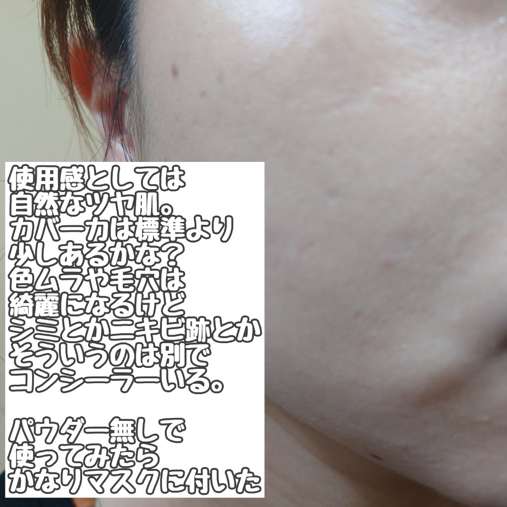 結論から言うと、スキンケア次第で乾燥しました。 塗ってすぐから顔にヒビ入るんじゃ?ってくらい乾燥した組み合わせもあった(笑) 手早く伸ばさないとダメ? これはね、ダメ(笑) スポンジ使わなきゃダメ? これは慣れたら多分専用スポンジである必要はないと思います。 失敗する? した。 1番大失敗だったなと思ったのは重ね付け。 密着感どう? これはね、、、 何回かパウダーつけ忘れた(笑) そのくらい肌の表面に最近使ってたファンデでは感じなかったさらり感があった。 最近ツヤ肌ブームだったけど ツヤ肌見慣れないっていう世代があるんだよ(私ど真ん中) 顔の立体感を楽しむとか 素肌感重視とか ツヤ肌の魅力もあるんだよ! でもさ、どうしてもテカリに見えるとか 顔のパーツがくっきりでツヤ肌にすると 暑苦しい顔になるとかあって みんながみんなツヤ肌似合うってことでも無いのよ。 この仕上がりは大人っぽくなる。 ツヤ肌、若々しい~ って感じより、落ち着いた雰囲気になる。