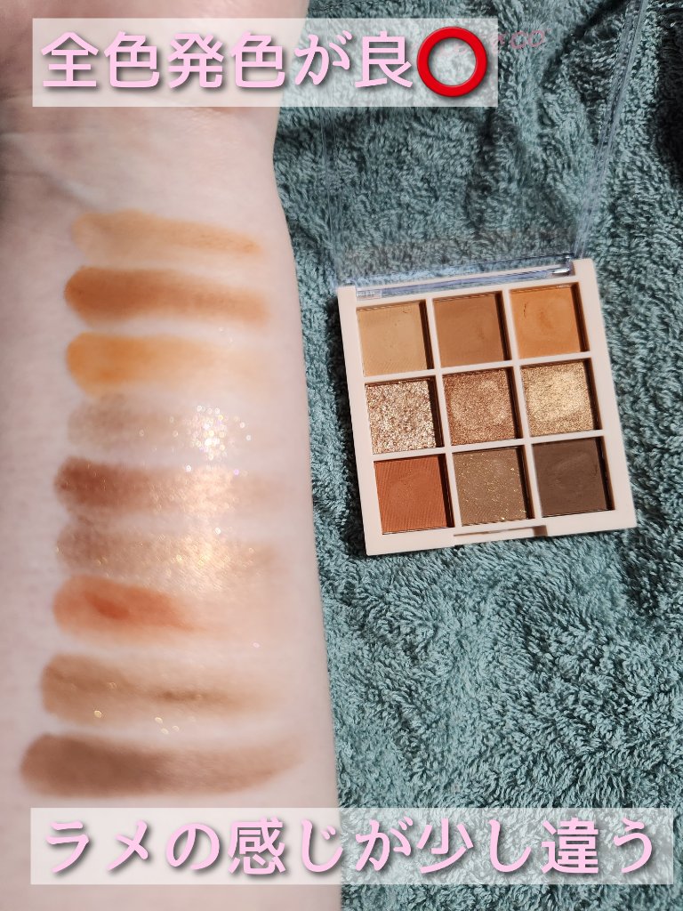 - ひとつでマット・シアーマット・パール・グリッター・ラメの多彩な質感とカラーバリエーションが楽しめる9色アイシャドウパレット。微細粒子で肌にぴったりフィットして馴染み、発色の良さが続きます。