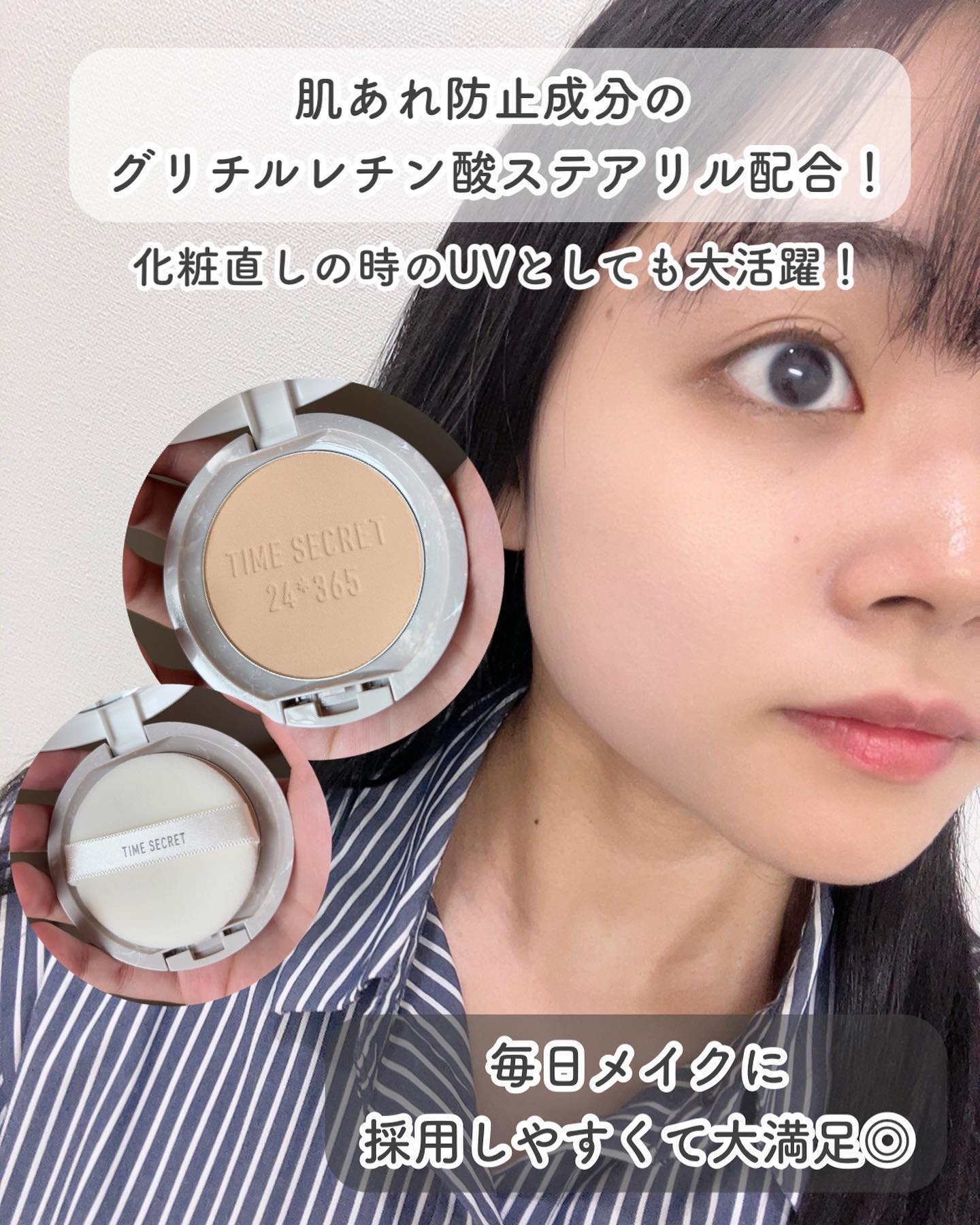 ファンデ級のカバー力! さらに肌あれまで防ぐ!タイムシークレットの「ミネラル薬用プレストパウダー」 厚塗り感を出さず、高いカバー力を実現。 隠したい毛穴、シミ、凹凸もカバー! 肌あれ防止成分配合 ↪︎グリチルレチン酸ステアリル