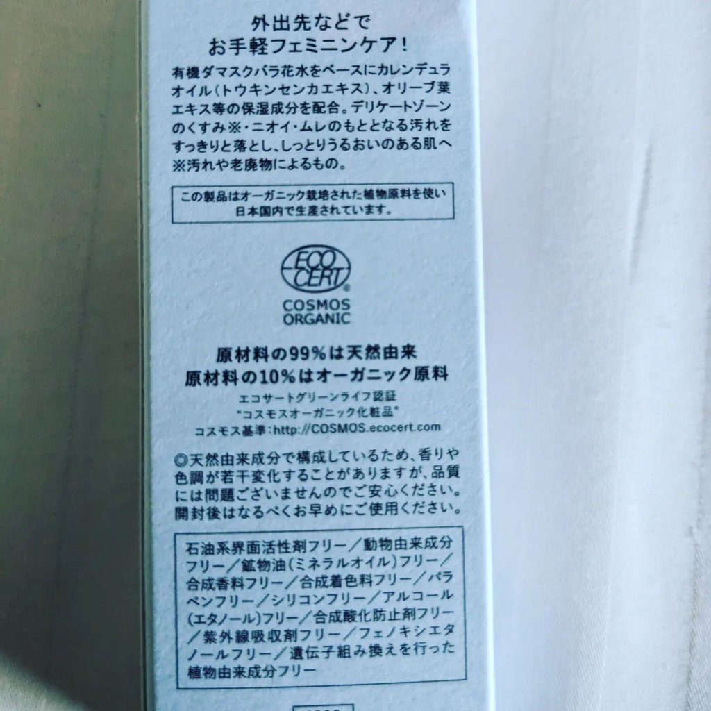 - 外出先などでお手軽フェミニンケア! フランス国際オーガニック認証機関ECOCERTが認証した「99%天然由来デリケートゾーン用拭き取りローション」有機ダマスクバラ花水をベースにカレンデュラオイル(トウキンセンカエキス)、オリーブ葉エキス等の保湿成分を配合。 デリケートゾーンのくすみ*・ニオイ・ムレのもととなる汚れをすっきり拭き取り、しっとりうるおいのある肌へ ※この製品はオーガニック栽培された植物原料を使い日本国内で生産されています。 *汚れや古い角質によるもの