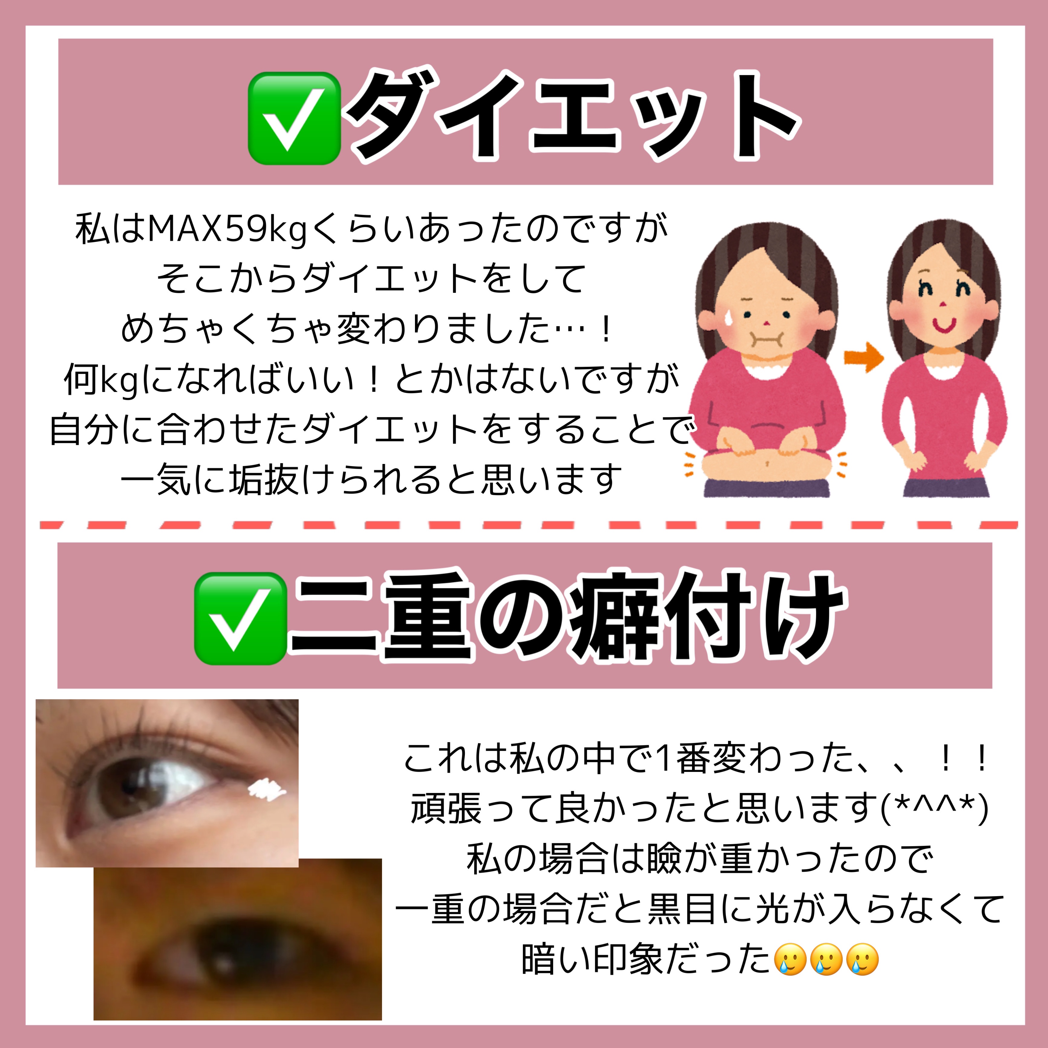 【瞼の筋トレ】について詳しく解説!!これさえすれば絶対変われます!!!瞼の筋トレって?という方は、画像をご覧下さい‼️これがないと私は今頃二重になってなかった…と言っても過言ではないくらい、私の癖付けには欠かせなかったものです!!今回は、昔からしている筋トレ1つと、最近思いついて実践している筋トレ2つをご紹介します!!どれもすごく簡単なので、ぜひ試してみてください📷Q 一日どのくらいしてた?A とにかく暇さえあればしていました!!1日30分の日もあれば、何時間もする日もありましたこの筋トレは、お風呂に入りながらや勉強しながら、スマホ見ながらでもできるのがいいところなので、スキマ時間を上手く活用するのがいいかな思います💭Q 今まで何回くらい筋肉痛になった?A 左右どちらも5回くらいだと思います!瞼が私より軽い方は、1、2回で十分スッキリすると思いますよ❣️Q どれくらいで筋肉痛になった?A 筋肉痛までは平均して2週間くらいかかりました!でもフォロワーさんの中には1日でなられた方も多くいらっしゃいますなのでその人の瞼や頑張り次第だと思います❣️Q 筋トレ1