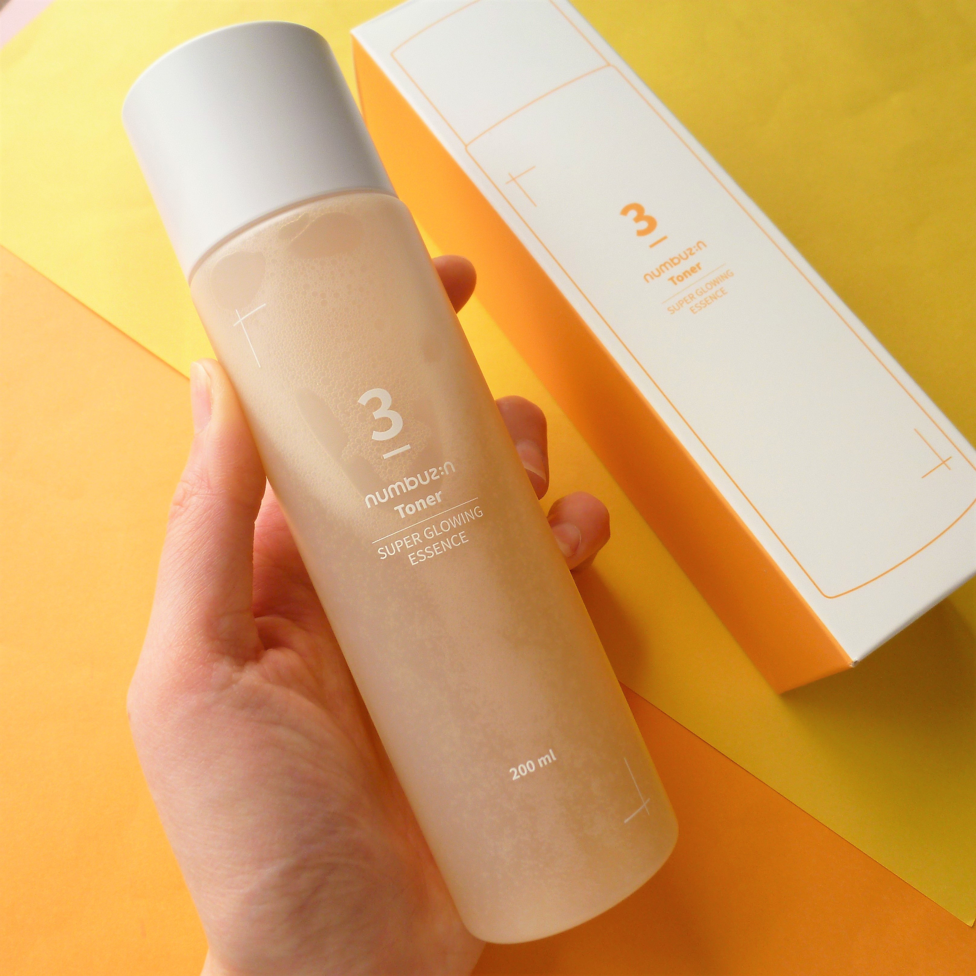 「ナンバーズイン 3番 うるツヤ発酵トナー」を使ってみました。表面と裏面が白色で、側面が鮮やかな黄色のパッケージでした。表面にトナーの絵が描かれているのが印象的でした。開けてみると、表面に描かれた形のトナーが出てきました。透明な黄色のボトルで...