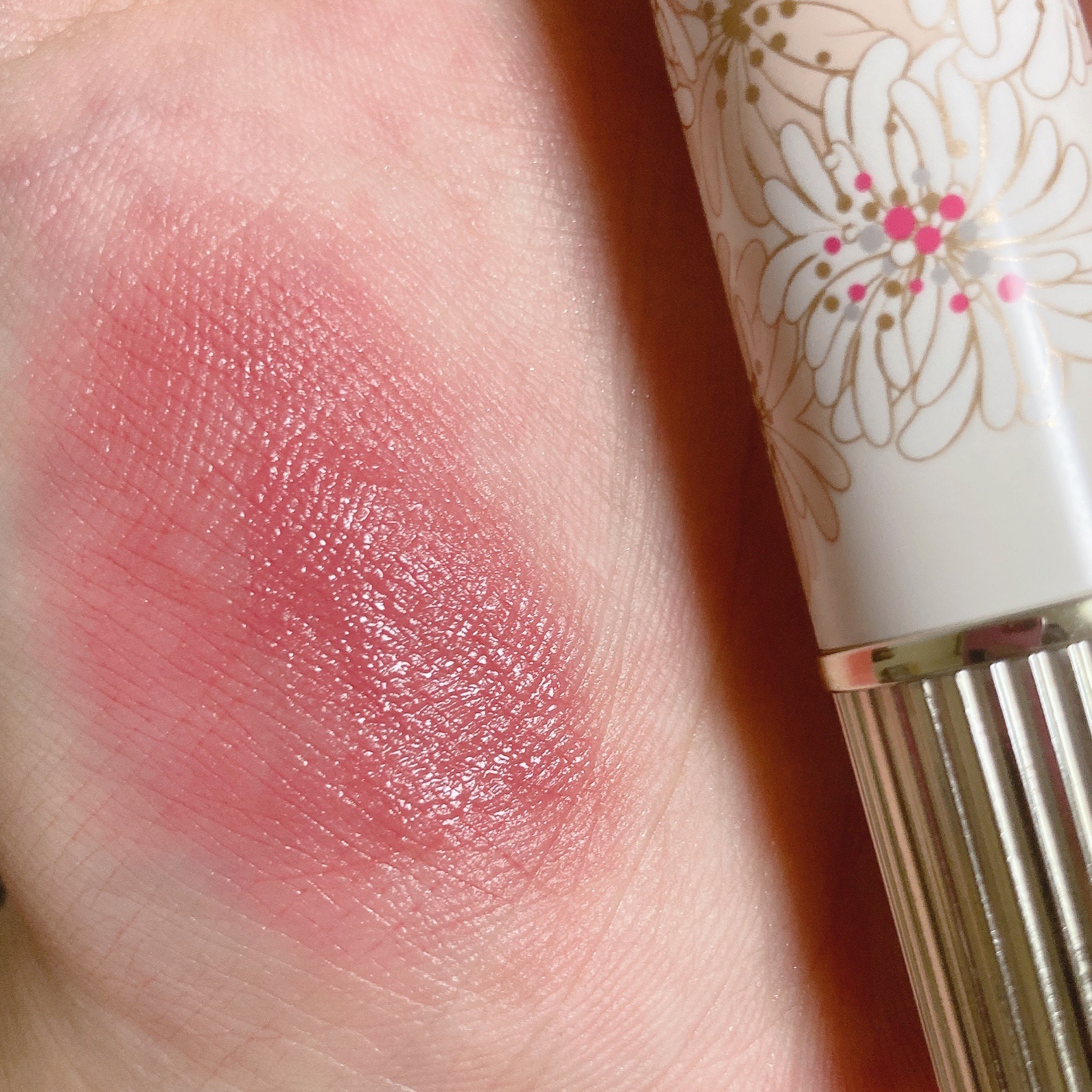 ベージュベースにゴールドとピンクのパールが入っているそうでツヤツヤの頬に仕上げてくれます☺️ 前回のラブリーチェリーは可愛らしい🍒イメージでしたが、今回のハニーシナモンは大人の色づく頬✨なんてイメージで。 可愛らしいメイクというよりも、シックで大人の女性的なメイクやファッションの時に大活躍☺️ 秋冬メイクにもぴったりだと思います😇✌️ ソフトな発色、なので調節もしやすいのでおすすめのチーク🥰💕
