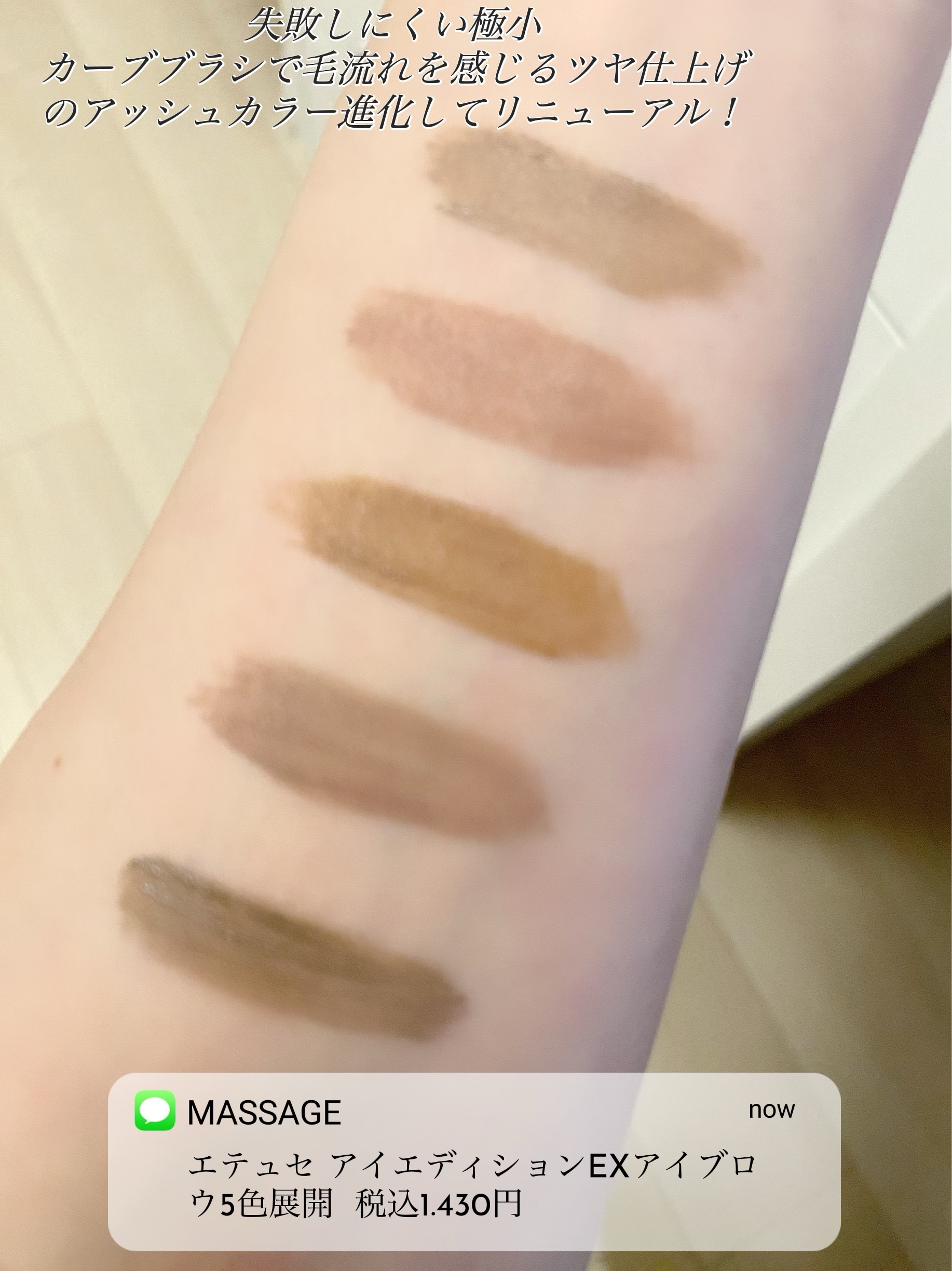 エテュセのブロウマスカラがリニューアル! トレンドの毛流れ感じる、ツヤ質感♪ アッシュ系ニュアンスカラーの眉マスカラ。 ヘアカラーに馴染みやすいアッシュカラーで小さめのブラシだから、初心者にも使いやすい✨ これからの時期に嬉しいウォータープルーフ処方◎ 私はアッシュオリーブ🫒がお気に入り🫶