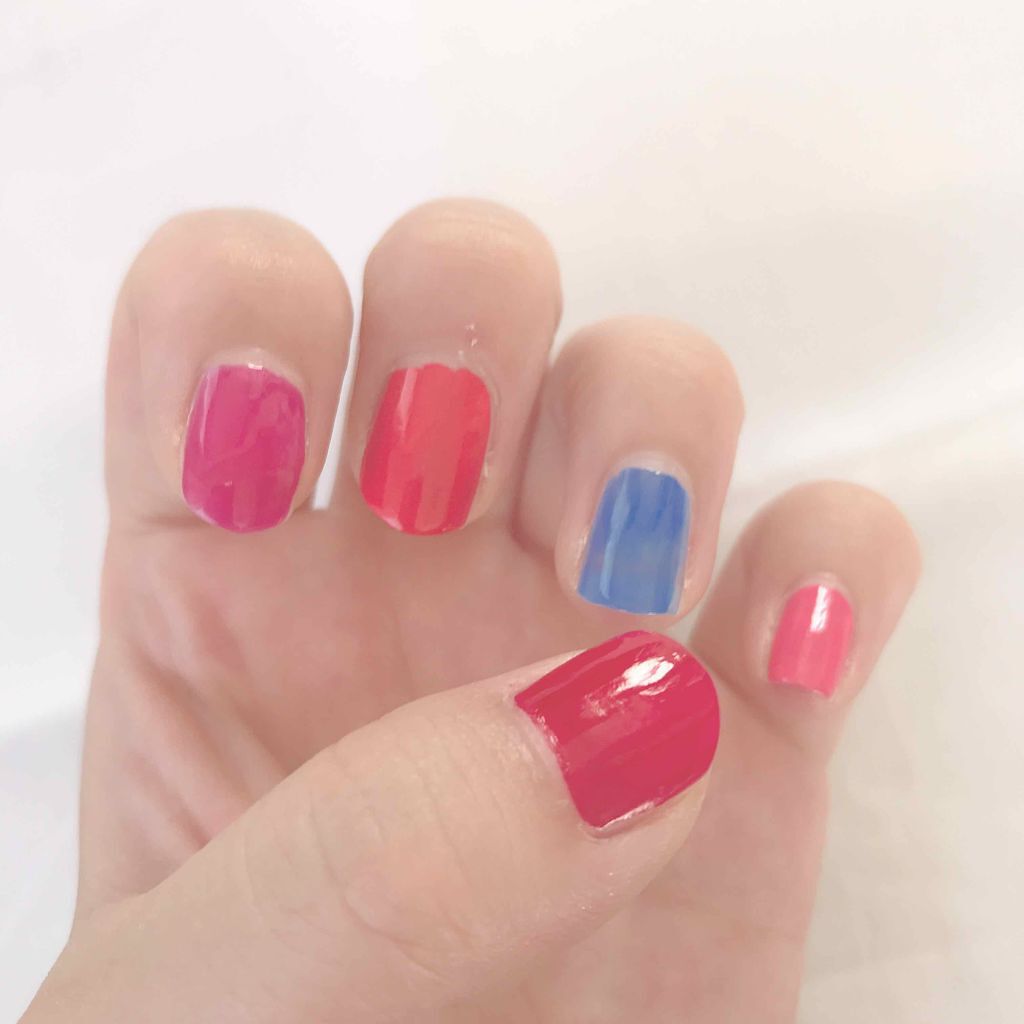 ネイルホリック4枚目写真親指からRD400PK810OR251BL908PK803発色がよく、塗り心地がいい!!むれなくキレイにこのネイルは塗ることができる!夏にピッタリな色もたくさん他にもあって色々試したいと思いました!2.3枚目で塗った様...