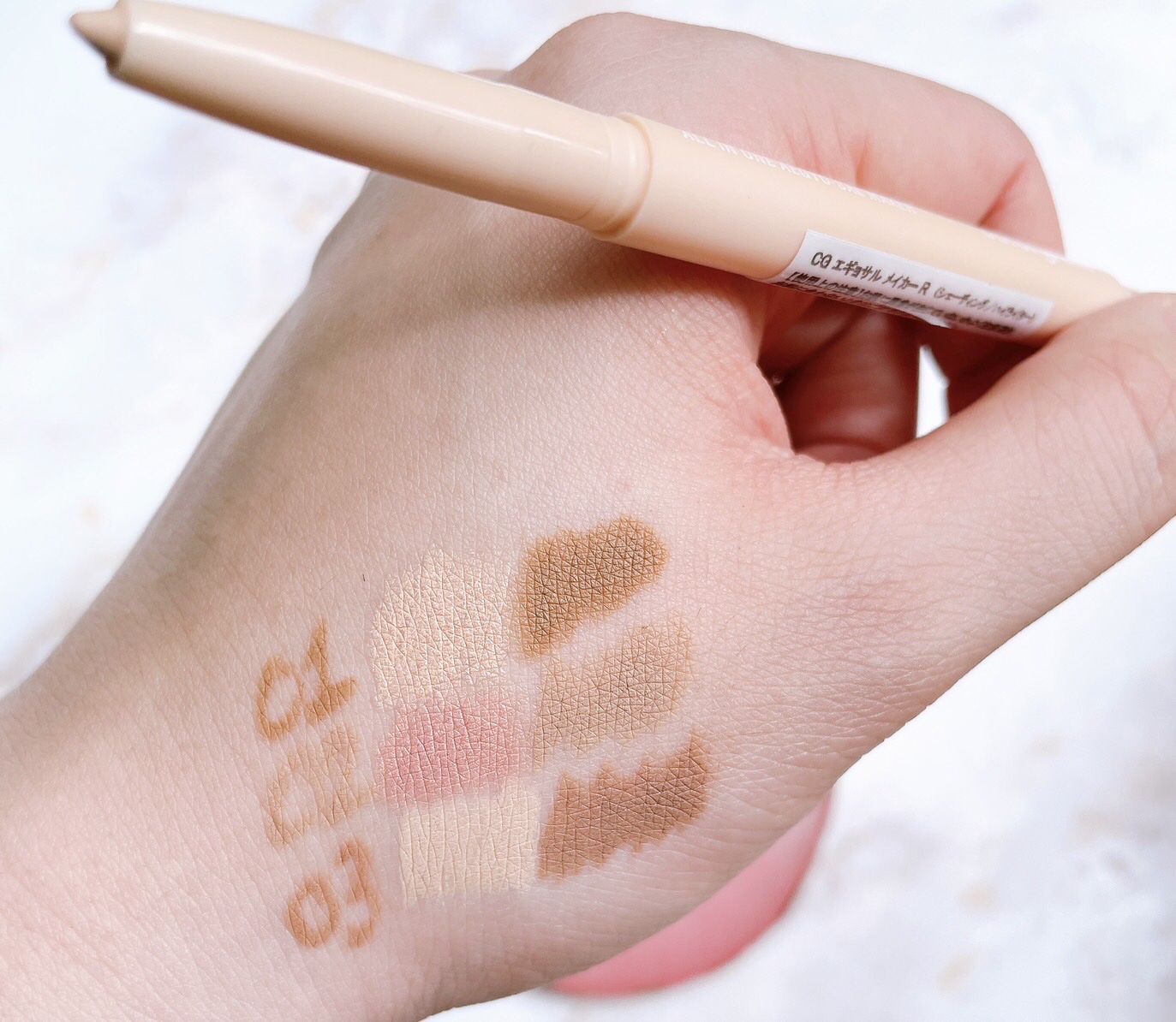 - <01 イエベ(WARM TONE)> COLOR エチルヘキサン酸アルキル(C12-15)、酸化チタン、ホウケイ酸(Ca/チタン)、フェニルトリメチコン、マイカ、トリイソステアリン酸ポリグリセリル-2、合成ワックス、キャンデリラロウ、合成フルオロフロゴパイト、モクロウ、(VP/ヘキサデセン)コポリマー、ポリイソブテン、酸化鉄、カルナウバロウ、ポリヒドロキシステアリン酸、カルミン、イソステアリン酸、パルミチン酸エチルヘキシル、ミリスチン酸イソプロピル、レシチン、酸化スズ、ポリリシノレイン酸ポリグリセリル-3、カプリリルグリコール、カプリル酸グリセリル SHADE 酸化チタン、酸化鉄、エチルヘキサン酸アルキル(C12-15)、フェニルトリメチコン、トリイソステアリン酸ポリグリセリル-2、合成ワックス、マイカ、キャンデリラロウ、(VP/ヘキサデセン)コポリマー、ポリイソブテン、カルナウバロウ、ポリヒドロキシステアリン酸、イソステアリン酸、パルミチン酸エチルヘキシル、ミリスチン酸イソプロピル、レシチン、ポリリシノレイン酸ポリグリセリル-3、カプリリルグリコール、カプリル酸グリセリル <02 ブルべ(COOL TONE)> COLOR エチルヘキサン酸アルキル(C12-15)、酸化チタン、マイカ、フェニルトリメチコン、トリイソステアリン酸ポリグリセリル-2、合成ワックス、ホウケイ酸(Ca/チタン)、キャンデリラロウ、合成フルオロフロゴパイト、酸化鉄、モクロウ、(VP/ヘキサデセン)コポリマー、ポリイソブテン、カルナウバロウ、ポリヒドロキシステアリン酸、カルミン、イソステアリン酸、パルミチン酸エチルヘキシル、ミリスチン酸イソプロピル、レシチン、ポリリシノレイン酸ポリグリセリル-3、カプリリルグリコール、カプリル酸グリセリル、酸化スズ SHADE 酸化チタン、エチルヘキサン酸アルキル(C12-15)、フェニルトリメチコン、トリイソステアリン酸ポリグリセリル-2、マイカ、合成ワックス、酸化鉄、キャンデリラロウ、(VP/ヘキサデセン)コポリマー、ポリイソブテン、カルナウバロウ、ポリヒドロキシステアリン酸、イソステアリン酸、パルミチン酸エチルヘキシル、ミリスチン酸イソプロピル、レシチン、ポリリシノレイン酸ポリグリセリル-3、カプリリルグリコール、カプリル酸グリセリル <03 リアル(REAL)> COLOR 酸化チタン、エチルヘキサン酸アルキル(C12-15)、フェニルトリメチコン、トリイソステアリン酸ポリグリセリル-2、合成ワックス、マイカ、キャンデリラロウ、酸化鉄、カルナウバロウ、(VP/ヘキサデセン)コポリマー、ポリイソブテン、ポリヒドロキシステアリン酸、イソステアリン酸、パルミチン酸エチルヘキシル、ミリスチン酸イソプロピル、レシチン、ポリリシノレイン酸ポリグリセリル-3、カプリリルグリコール、カプリル酸グリセリル SHADE 酸化チタン、エチルヘキサン酸アルキル(C12-15)、フェニルトリメチコン、トリイソステアリン酸ポリグリセリル-2、マイカ、酸化鉄、合成ワックス、キャンデリラロウ、(VP/ヘキサデセン)コポリマー、ポリイソブテン、カルナウバロウ、ポリヒドロキシステアリン酸、イソステアリン酸、パルミチン酸エチルヘキシル、ミリスチン酸イソプロピル、レシチン、ポリリシノレイン酸ポリグリセリル-3、カプリリルグリコール、カプリル酸グリセリル <07 ウォームピーチ(WARM PEACH)> COLOR エチルヘキサン酸アルキル(C12-15)、フェニルトリメチコン、酸化チタン、マイカ、ホウケイ酸(Ca/チタン)、トリイソステアリン酸ポリグリセリル-2、合成フルオロフロゴパイト、合成ワックス、キャンデリラロウ、モクロウ、酸化鉄、(VP/ヘキサデセン)コポリマー、ポリイソブテン、カルナウバロウ、ポリヒドロキシステアリン酸、ジメチコン、イソステアリン酸、パルミチン酸エチルヘキシル、ミリスチン酸イソプロピル、レシチン、(ビニルジメチコン/メチコンシルセスキオキサン)クロスポリマー、酸化スズ、ポリリシノレイン酸ポリグリセリル-3、トリエトキシカプリリルシラン、カプリリルグリコール、カプリル酸グリセリル SHADE 酸化チタン、エチルヘキサン酸アルキル(C12-15)、フェニルトリメチコン、マイカ、トリイソステアリン酸ポリグリセリル-2、合成ワックス、酸化鉄、キャンデリラロウ、(VP/ヘキサデセン)コポリマー、ポリイソブテン、カルナウバロウ、ポリヒドロキシステアリン酸、ジメチコン、イソステアリン酸、パルミチン酸エチルヘキシル、ミリスチン酸イソプロピル、レシチン、(ビニルジメチコン/メチコンシルセスキオキサン)クロスポリマー、ポリリシノレイン酸ポリグリセリル-3、カプリリルグリコール、カプリル酸グリセリル