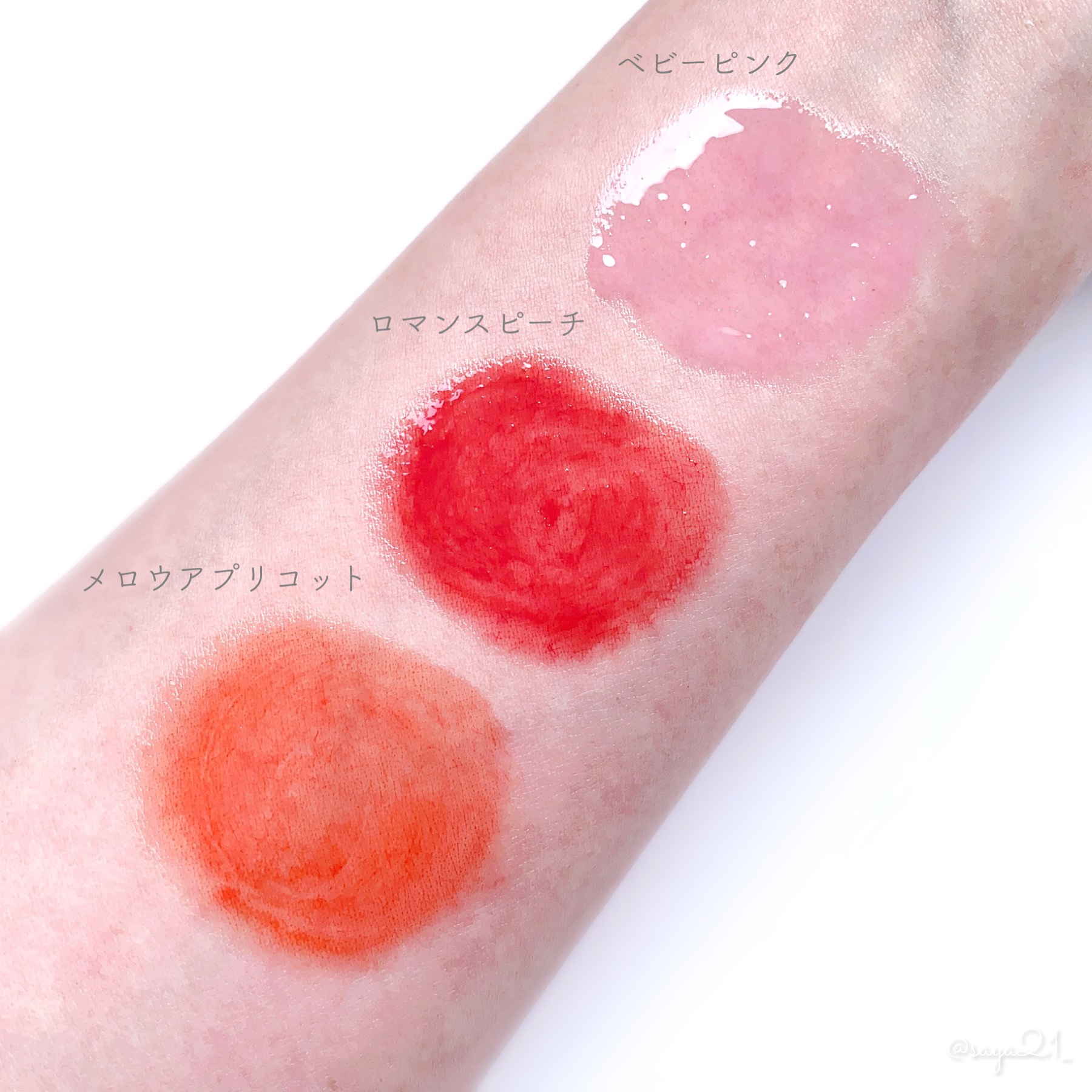 - <ベビーピンク> 水添ポリイソブテン、トリ(カプリル酸/カプリン酸)グリセリル、ポリイソブテン、(エチレン/プロピレン/スチレン)コポリマー、ホホバ種子油、タカサブロウエキス、メントール、酸化チタン、(ブチレン/エチレン/スチレン)コポリマー、香料、メリアアザジラクタ葉エキス、赤218、ワサビノキ種子油、テトラジブチルヒドロキシヒドロケイヒ酸ペンタエリスリチル、水酸化Al、トリエトキシカプリリルシラン <メローアプリコット> 水、ジフェニルジメチコン、リンゴ酸ジイソステアリル、水添ポリイソブテン、ビスジグリセリルポリアシルアジペート-2、ダイマージリノール酸(フィトステリル/イソステアリル/セチル/ステアリル/ベヘニル)、ジグリセリン、水添ポリデセン、セチルPEG/PPG-10/1ジメチコン、ポリソルベート60、ステアリン酸グリセリル、ステアリン酸PEG-100、スクワラン、トリイソステアリン酸ポリグリセリル-2、セスキオレイン酸ソルビタン、イソステアリン酸ソルビタン、(アクリル酸ヒドロキシエチル/アクリロイルジメチルタウリンNa)コポリマー、エチルヘキシルグリセリン、1,2-ヘキサンジオール、フェノキシエタノール、酸化チタン、酸化鉄、赤227、黄5、黄4 <ロマンスピーチ> 水、ジフェニルジメチコン、リンゴ酸ジイソステアリル、水添ポリイソブテン、ビスジグリセリルポリアシルアジペート-2、ダイマージリノール酸(フィトステリル/イソステアリル/セチル/ステアリル/ベヘニル)、ジグリセリン、水添ポリデセン、セチルPEG/PPG-10/1ジメチコン、ポリソルベート60、ステアリン酸グリセリル、ステアリン酸PEG-100、スクワラン、トリイソステアリン酸ポリグリセリル-2、セスキオレイン酸ソルビタン、イソステアリン酸ソルビタン、(アクリル酸ヒドロキシエチル/アクリロイルジメチルタウリンNa)コポリマー、エチルヘキシルグリセリン、1,2-ヘキサンジオール、フェノキシエタノール、香料、酸化チタン、酸化鉄、赤227、黄4