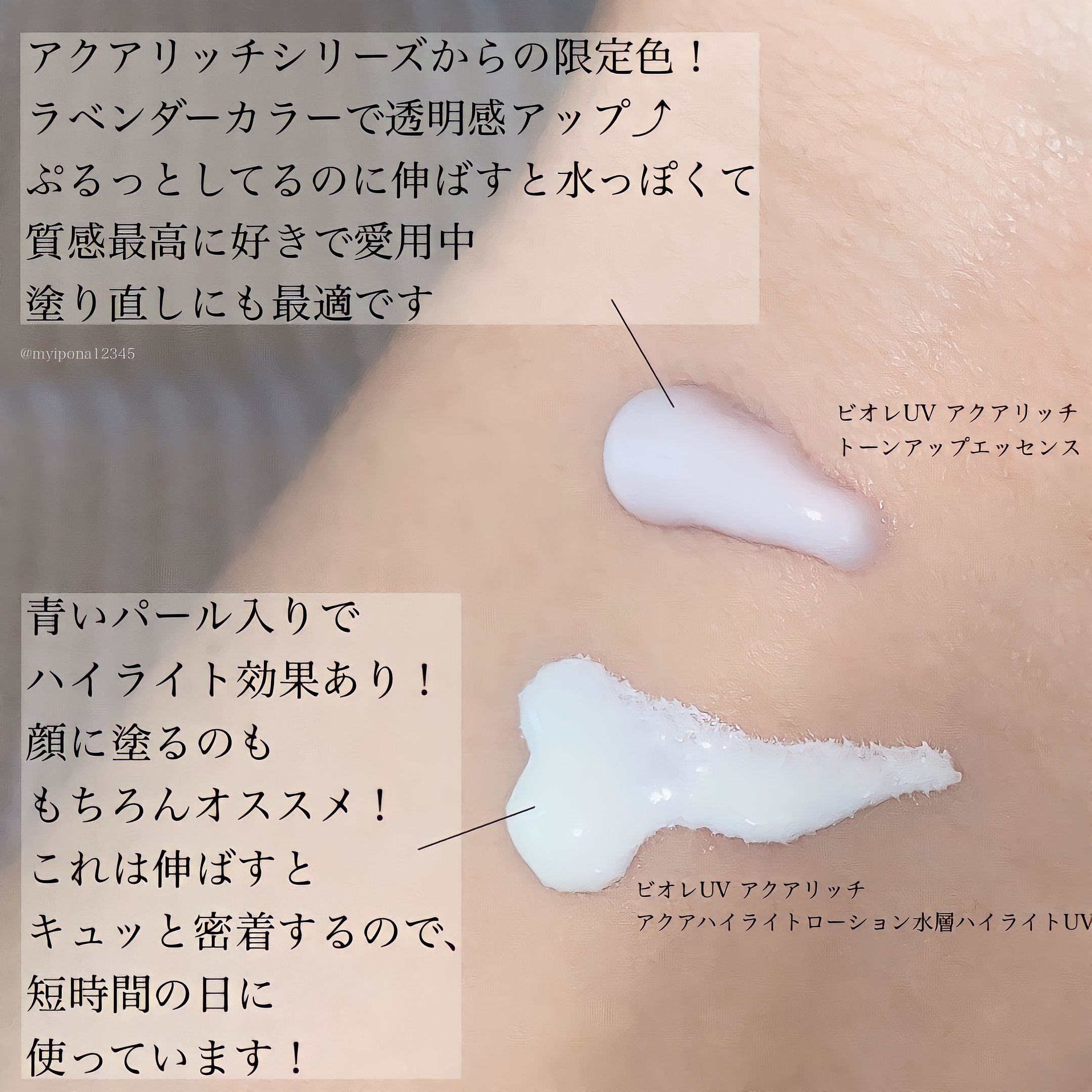 ビオレUVアクアリッチトーンアップエッセンスSPF50+PA++++ビオレってブルー系のイメージだよね?!今回、今までのビオレとは違うパケだなと思いながら購入してみたら、予想以上に当たりだった🥰可愛いラベンダーカラーで化粧下地にもなって、皮脂...
