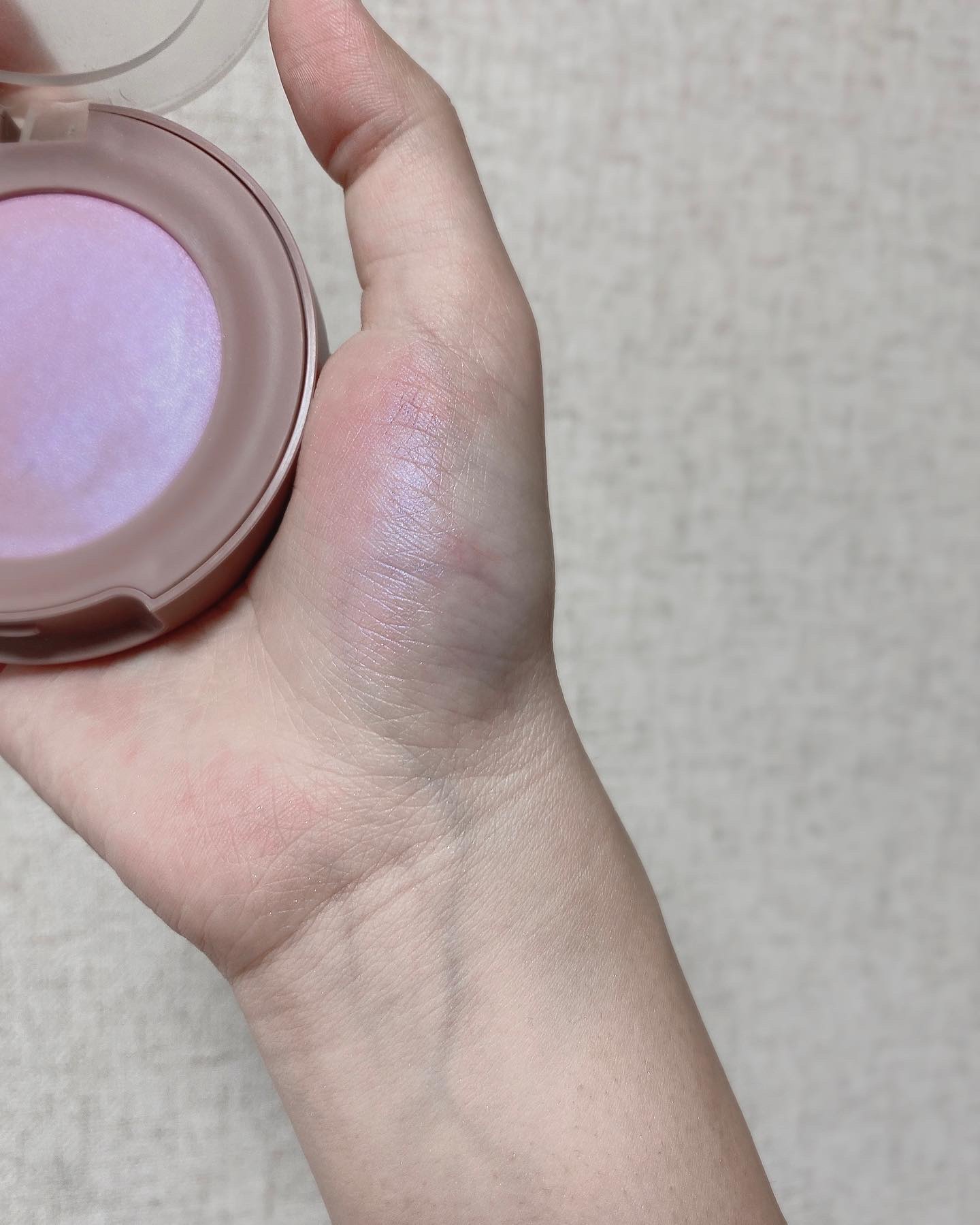 ピュアな彩り咲き誇る、ポップなチークカラー。 購入したものは、可愛らしさと爽やかさを感じる鮮やかなパープルカラー。 くすみのない鮮やかな色味だが、肌にのせるとふわりと青みピンクに発色してくれてかなり使いやすい。 しかししっかりと透明感は引き出してくれるので優秀なアイテム。 ほのかにパールも感じるので、透けるような発色も相まってかなり優美な雰囲気のメイクに。 そして、人気の理由は優秀その質感に留まらず、可愛らしいパッケージにもあるだろう。 全てのカラーに刻印されたガーベラには綺麗な美術品を見た時に似た魅力を感じる。 刻印を消すのが勿体ないので付けるのを躊躇ってしまうくらい。 気になる点を強いて挙げるとすれば、付属のブラシが無い為にチークブラシを出すのが面倒なくらい。 しかしこれは性格の面がかなり強いので商品としては全く問題ない。 他の色も本当に素敵なのでぜひ。 まさに頬に花が咲いたような雰囲気にしてくれるチーク。