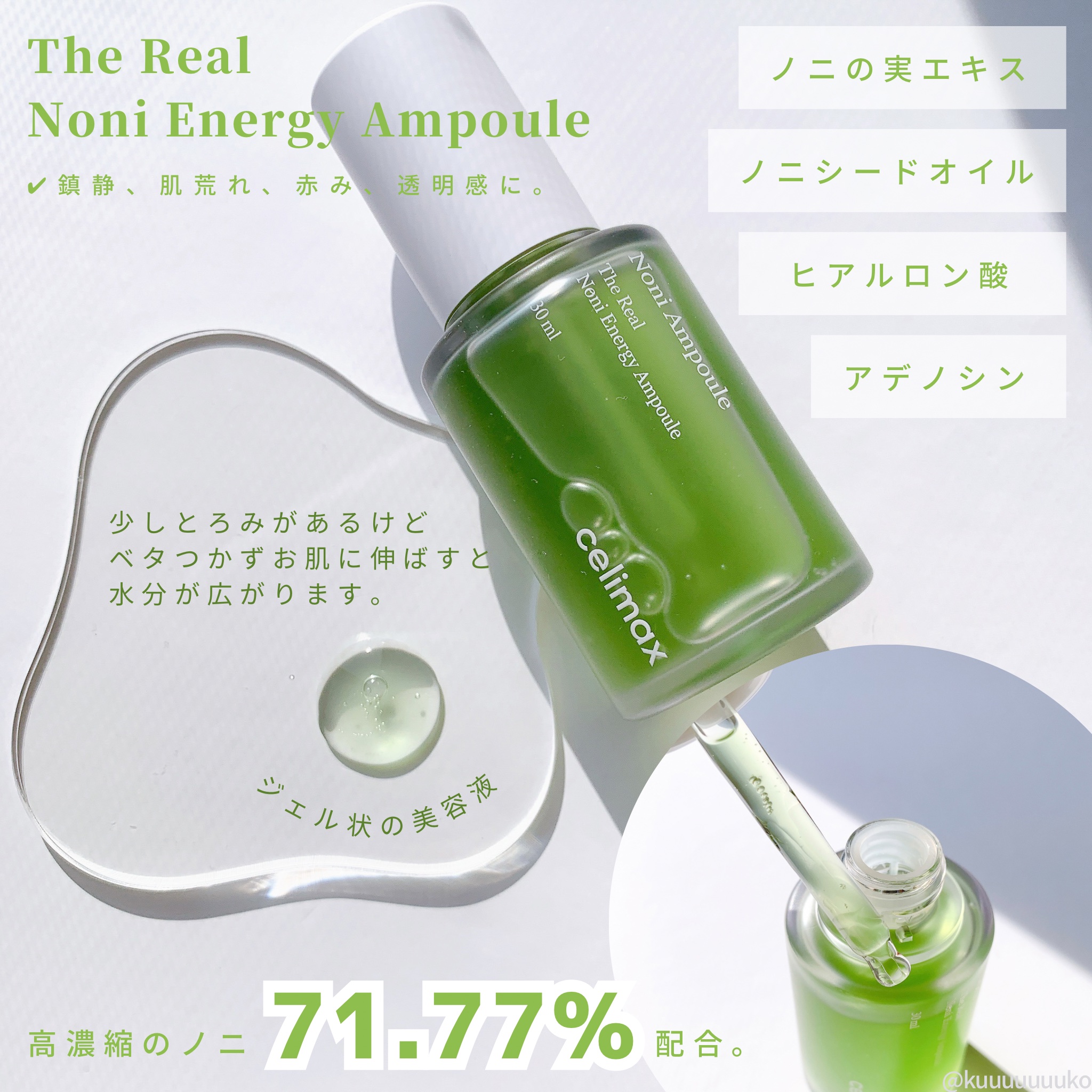 - <Noni Ampule> ノニ果実エキス(71.77%)、BG、プロパンジオール、グリセリン、1,2-ヘキサンジオール、コ ハク酸ジエトキシエチル、(アクリル酸グリセリル/アクリル酸)コポリマー、ノニシードオイル (1ppm)、セラミドNP、オリーブオイル、シア脂、スクワラン、ローズマリーリーフオイル、ニー ムリーフエキス、ニーム花エキス、カカオエキス、デキストリン、フィトスフィンゴシン、コレステ ロール、ヒアルロン酸Na、水添レシチン、(C12,13)パレス-9、ポリアクリロイルジメチル タウリンNa、トリ(カプリル/カプリン酸)グリセリル、精製水、アラントイン、アデノシン、ED TA-2Na、クロルフェネシン