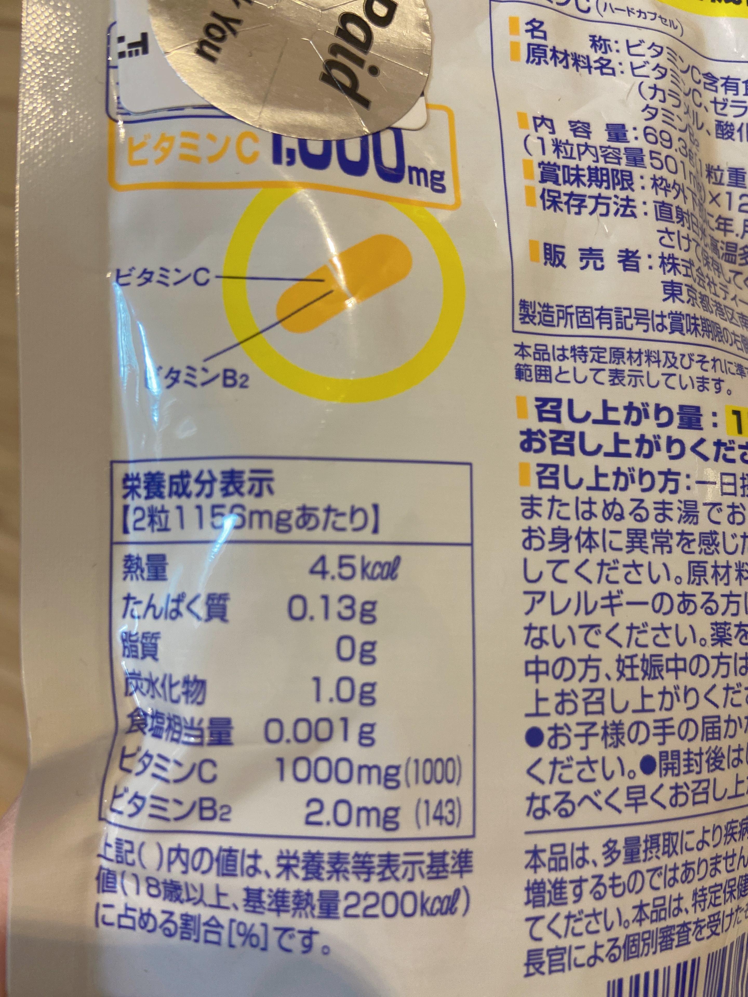 - ビタミンCとその働きを助けるビタミンB2をプラスしたサプリメントです。 ビタミンCは、皮膚や粘膜の健康維持を助けるとともに、抗酸化作用をもつ栄養素です。ハードカプセルなので、ビタミンCの酸味が苦手な方にもおすすめです。 栄養機能表示 ●ビタミンCは、皮膚や粘膜の健康維持を助けるとともに、抗酸化作用をもつ栄養素です。 ●ビタミンB2は、皮膚や粘膜の健康維持を助ける栄養素です。 ※本品は、多量摂取により疾病が治癒したり、より健康が増進するものではありません。一日の摂取目安量を守ってください。 ※本品は、特定保健用食品と異なり、消費者庁長官による個別審査を受けたものではありません。 ※水またはぬるま湯でお召し上がりください。 【名称】 ビタミンC含有食品 【原材料名】 ビタミンC、ゼラチン、着色料(カラメル、酸化チタン)、ビタミンB2 【飲み方】 一日の摂取目安量2粒 【栄養成分表示】 [1日あたり:2粒1156mg] 熱量4.5kcal、たんぱく質0.13g、脂質0g、炭水化物1.0g、食塩相当量0.001g、ビタミンC 1000mg(1000)、ビタミンB2 2.0mg(143) 上記( )内の値は、栄養素等表示基準値(18歳以上、基準熱量2200kcal)に占める割合[%]です。 アレルギー物質 ゼラチン ※一日の目安量を守って、お召し上がりください。 ※お身体に異常を感じた場合は、摂取を中止してください。 ※特定原材料及びそれに準ずるアレルギー物質を対象範囲として表示しています。原材料をご確認の上、食物アレルギーのある方はお召し上がりにならないでください。 ※薬を服用中あるいは通院中の方、妊娠中の方は、お医者様にご相談の上お召し上がりください。 ●直射日光、高温多湿な場所をさけて保存してください。 ●お子様の手の届かないところで保管してください。 ●開封後はしっかり開封口を閉め、なるべく早くお召し上がりください。 食生活は、主食、主菜、副菜を基本に、食事のバランスを。