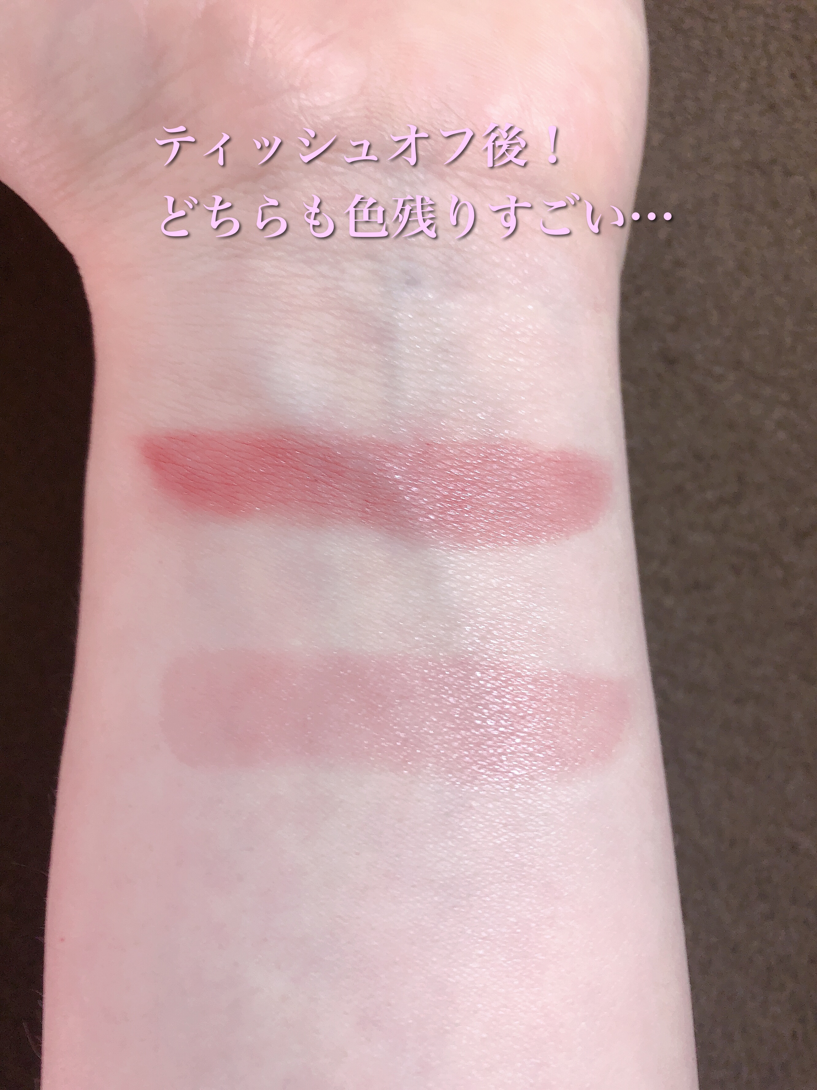 色味が公式と違う感じがしました。公式だとニュートラルなローズピンクという印象でしたが、実際に腕に出してみるとオレンジピンクな色味。 ラメは繊細な輝きで美しく、密着力がありました!ラメだけ単体で発売して欲しいくらい。 私個人としては合わなかったというだけなので、ご参考までに。