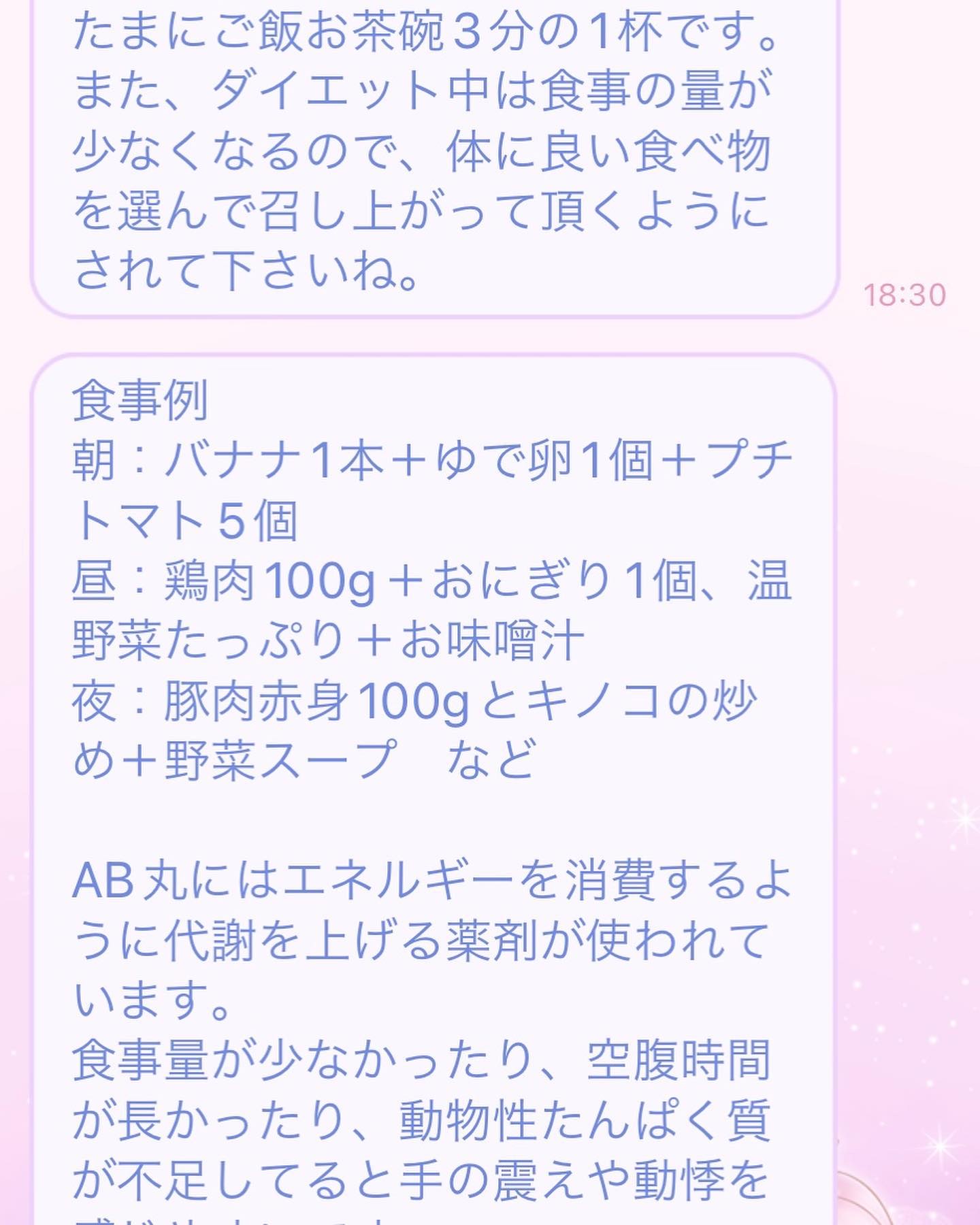 食欲抑制効果 運動効果 自然成分100%のダイエット韓方です。 LINEで問診を受けてから体型、生活習慣など個人それぞれにあった処方を院長先生からしていただきます。その種類なんと30種類! AB丸を服用すると運動効果がある為、カフェインを摂取することで眠れない、頭痛、フラフラしたりすることがありました。 AB丸を飲むとお腹が減らない、意識せずとも食べる量が減っていました。