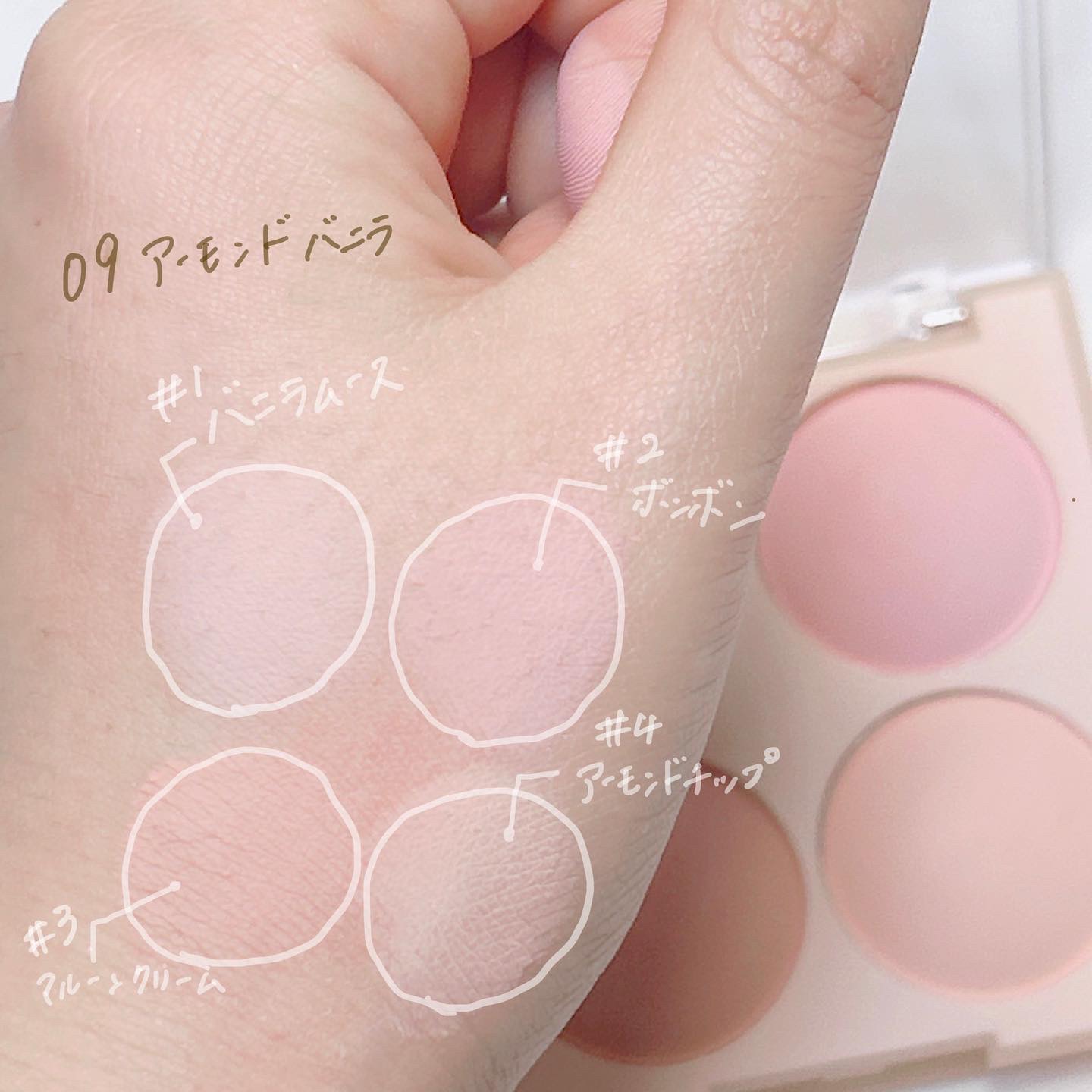 1 Vanilla Mousse バニラムース 白いクリームを加ええた柔らかいブラウン系カラーで仄かなムードを加えてくれるカラー 2 Bon Bon ボンボン ピンク色がほんのり溢れるヌーディーな杏色で仄かなムードを加えてくれるカラー 4 Almond Chip アーモンドチップ 少し焼いたアーモンド色に似た深いウォームベージュトーンカラー ずっとクリニークのヌードポップを使ってたけど 底見えしてきたから似た色を探してて見つけたこれ🫶 まずアイスクリームがテーマでパケが可愛い 4色ともヌーディーなカラーで肌馴染みが良くて オレンジメイクにもピンクメイクにも合うから万能💖 重ねれば重ねるほどしっかり発色してくれる! 使うだけで気分が上がるトキメキコスメ🫣