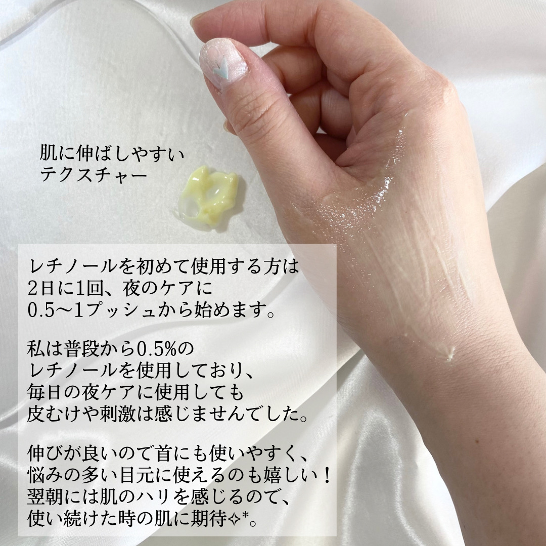レチノールの効果を贅沢に届けながら刺激感を抑えた美容液。贅沢成分を黄金比率配合し、毛穴目立ち×ハリにアプローチして”ゼロ距離”にも耐えうる毛穴レス印象肌へ。 毎日のケアに取り入れやすい、穏やかな使用感のレチノール。こっくりとしたテクスチャーですが、伸びが良くて軽い使用感。 使い続ける事で肌がつるんっとなめらかに見えて、肌にツヤ感とふっくら感が宿るのが◎まさにアプリのフィルター級のなめらか肌に…🥹🫶🏻