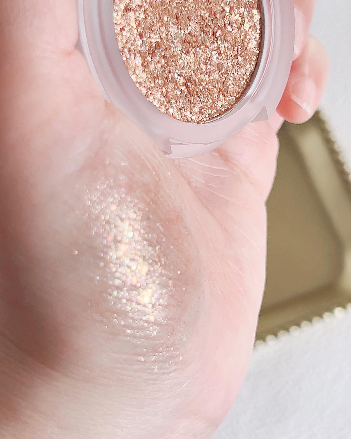 やわらかいテクスチャで体温で溶けるようにまぶたになじむので密着度が高く、長時間経っても粉飛びしにくく色浮きも気になりません クリアな発色で派手になりすぎず、まぶた全体に使っていただけます 屋外でも目元がキラキラして可愛かったよ
