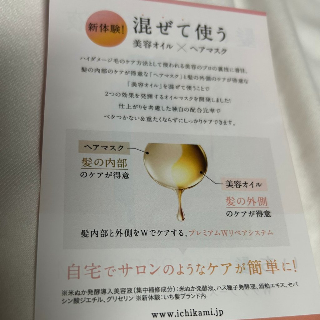 - ●「日本の髪を本質から考える。*1」ヘアケアブランド ●日本の髪研究の成果。アイロン等の熱ダメージによる乾燥髪のためのプレミアムダメージケアシリーズ ●今まで体験したことのない*2美容オイルを注入、混ぜるヘアマスク(洗い流すトリートメント) ●手触り、感動的。集中補修×オイルコートで、ヘアマスクとも、ヘアオイルとも違う体験で、つるんとした髪へ。 ●髪内部と外側をWでケアする「プレミアムWリペアシステム」 ・集中補修成分「高濃度*3米ぬか発酵導入美容液*4」配合のヘアマスクで、髪の内部を補修 ・指通りUP成分「和草・導入美容オイル*5」とドライヤーの熱を味方にキューティクルを密着する「ヒートリペアコート成分*6」で、髪の外側をコートして指通りをアップ ●つややかな八重桜の香り(天然桜エッセンス配合香料) ●サルフェートフリー(硫酸系界面活性剤不使用) ●合成着色料フリー *1:日本の風土や気候などの環境に合わせたヘアケア方法を研究しています。 *2:いち髪ブランド内 *3:いち髪 THE PREMIUM エクストラダメージケアトリートメント(シャイニーモイスト)比 *4:米ぬか発酵液、ハス種子発酵液、酒粕エキス、セバシン酸ジエチル、グリセリン *5:米胚芽油、オリザノール、セバシン酸ジエチル *6: γ-ドコサラクトン