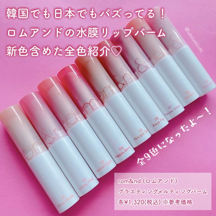 \rom&ndグラスティングメルティングバーム/01 ココヌード CocoNude02 ラヴィーピンク LoveyPink03 ソルベバーム SorbetBalm05 ヌガーサンド NougatSand06カヤフィグKayaFig07 モーブ...