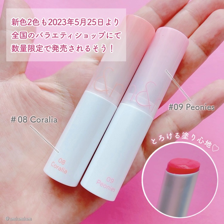 - もちっとした水膜で弾けそうなツヤリップ 1.軽い塗り心地のなめらかで透明な水爆弾ツヤ 2.塗った瞬間から唇を鮮やかに彩る多彩なカラーバーム 3.植物性保湿オイルでしっとりもっちり保湿バーム