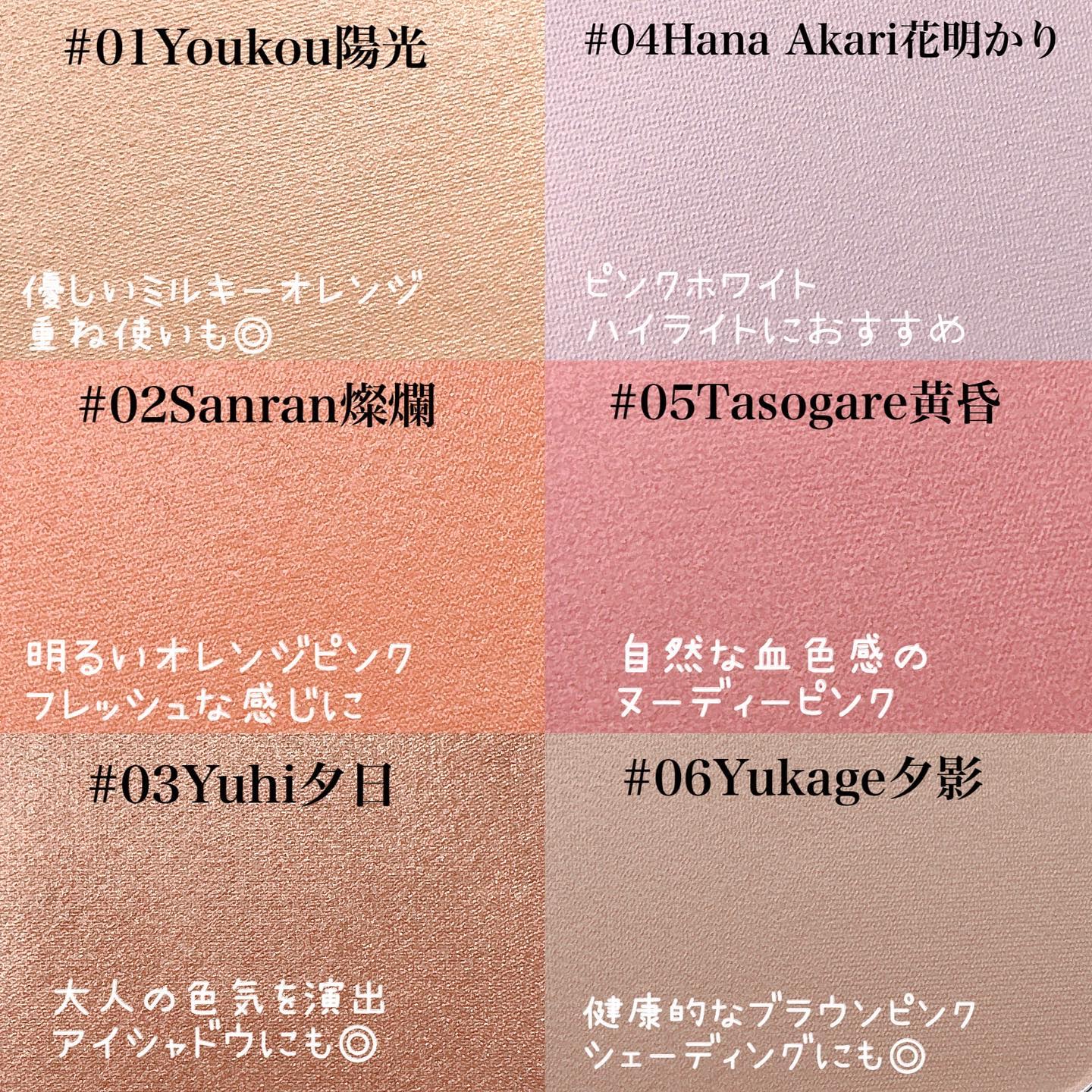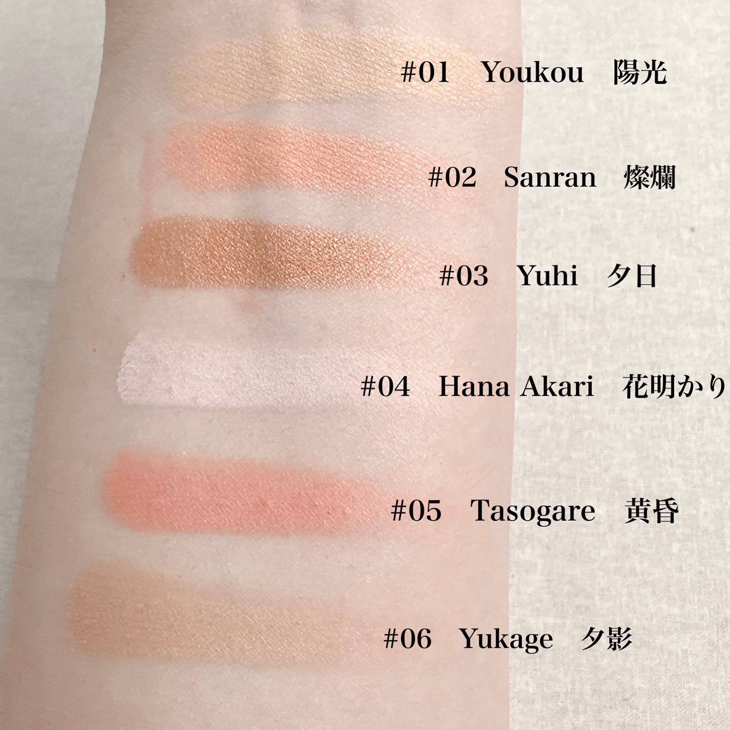 - #01 Youkou マイカ、トリエチルヘキサノイン、シリカ、合成ワックス、リンゴ酸ジイソステアリル、ヘキサ(ヒドロキシステアリン酸/ステアリン酸/ロジン酸)ジペンタエリスリチル、セスキイソステアリン酸ソルビタン、エチルヘキシルグリセリン、メチルパラベン、酢酸トコフェロール、フェノキシエタノール、(+/-)酸化チタン、合成フルオロフロゴパイト、ステアリン酸亜鉛、酸化鉄、黄5、ホウケイ酸(Ca/Na)、赤201、酸化スズ #02 Sanran マイカ、トリエチルヘキサノイン、シリカ、合成ワックス、リンゴ酸ジイソステアリル、ヘキサ(ヒドロキシステアリン酸/ステアリン酸/ロジン酸)ジペンタエリスリチル、セスキイソステアリン酸ソルビタン、エチルヘキシルグリセリン、メチルパラベン、酢酸トコフェロール、フェノキシエタノール、(+/-)酸化チタン、合成フルオロフロゴパイト、ステアリン酸亜鉛、酸化鉄、黄5、ホウケイ酸(Ca/Na)、赤201、酸化スズ #03 Yuhi マイカ、トリエチルヘキサノイン、シリカ、合成ワックス、リンゴ酸ジイソステアリル、ヘキサ(ヒドロキシステアリン酸/ステアリン酸/ロジン酸)ジペンタエリスリチル、セスキイソステアリン酸ソルビタン、エチルヘキシルグリセリン、メチルパラベン、酢酸トコフェロール、フェノキシエタノール、(+/-)酸化チタン、合成フルオロフロゴパイト、ステアリン酸亜鉛、酸化鉄、黄5、ホウケイ酸(Ca/Na)、赤201、酸化スズ #04 Hana Akari マイカ、トリエチルヘキサノイン、タルク、シリカ、カオリン、ヘキサ(ヒドロキシステアリン酸/ステアリン酸/ロジン酸)ジペンタエリスリチル、エチルヘキシルグリセリン、ジメチコン、トリエトキシカプリリルシラン、酢酸トコフェロール、フェノキシエタノール、(+/-)酸化チタン、酸化鉄、赤201、カルミン、黄5 #05 Tasogare マイカ、トリエチルヘキサノイン、タルク、シリカ、カオリン、ヘキサ(ヒドロキシステアリン酸/ステアリン酸/ロジン酸)ジペンタエリスリチル、エチルヘキシルグリセリン、ジメチコン、トリエトキシカプリリルシラン、酢酸トコフェロール、フェノキシエタノール、(+/-)酸化チタン、酸化鉄、赤201、カルミン、黄5 #06 Yukage マイカ、トリエチルヘキサノイン、タルク、シリカ、カオリン、ヘキサ(ヒドロキシステアリン酸/ステアリン酸/ロジン酸)ジペンタエリスリチル、エチルヘキシルグリセリン、ジメチコン、トリエトキシカプリリルシラン、酢酸トコフェロール、フェノキシエタノール、(+/-)酸化チタン、酸化鉄、赤201、カルミン、黄5