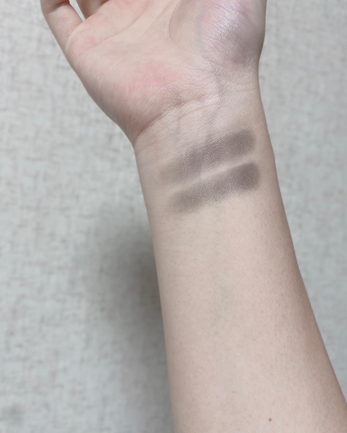 パウダーなのにみずみずしい♥ 全体的に濡れた様な艶が綺麗なアイシャドウで、屋内で見ても屋外で見ても最高にラメが綺麗。 左のカラーは白を多く混ぜたラベンダーカラーで、ベースカラーにぴったりな色。ラメがぱっと瞼を明るくしてくれる。 中央のカラーは、発色そのものは左のカラーと大差無いが、ラメの多さが違いこちらの方がよりぎっしり。多色ラメが宝石の様に散りばめられていて、ラメ好きにはたまらない。 右のカラーは深みの感じるパープルブラウン。締め色カラーだが私は二重幅ぐらいまでがっつりぬるのが目元に奥行きとかっこよさが出て好き。 どのカラーも自然に目を大きく見せてくれる。グラデーションもしやすく、また3色というのも捨て色が無いので非常に使いやすい。 粉はパサパサしてはいないが少しラメ飛びはするかもしれない。 ただ、こういった青みが強いかつ、普段使いしやすいアイシャドウパレットはなかなか無いのでありがたい。 きらめく艶が綺麗なので、別のカラーの購入の方も検討したい。