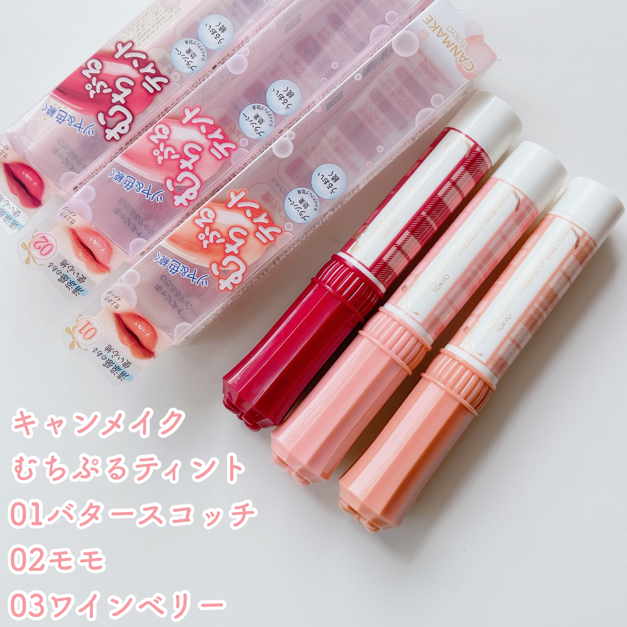 \キャンメイクむちぷる全色パソカ図鑑/📝キャンメイクむちぷるティント¥77001バタースコッチ02モモ03ワインベリー05フィグピューレ06ラズベリーケーキ07フルーツオレ40thxストロベリーボンボン#キャンメイク#プチプラコスメ#ティント...