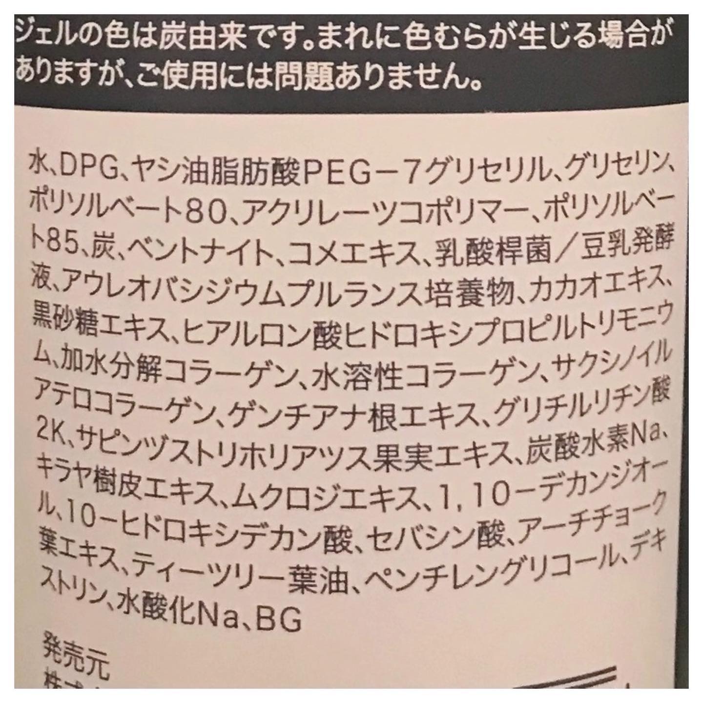 - <150g> 水、ペンチレングリコール、BG、グリセリン、水溶性コラーゲン、グリチルリチン酸2K、ティーツリー葉油、DPG、加水分解コラーゲン、水酸化Na、ヒアルロン酸ヒドロキシプロピルトリモニウム、炭酸水素Na、デキストリン、ポリソルベート85、サピンヅストリホリアツス果実エキス、ゲンチアナ根エキス、黒砂糖エキス、アクリレーツコポリマー、アーチチョーク葉エキス、炭、ポリソルベート80、キラヤ樹皮エキス、ヤシ油脂肪酸PEG-7グリセリル、ベントナイト、10-ヒドロキシデカン酸、アウレオバシジウムプルランス培養物、セバシン酸、1,10-デカンジオール、コメエキス、サクシノイルアテロコラーゲン、ムクロジエキス、カカオエキス、乳酸桿菌/豆乳発酵液