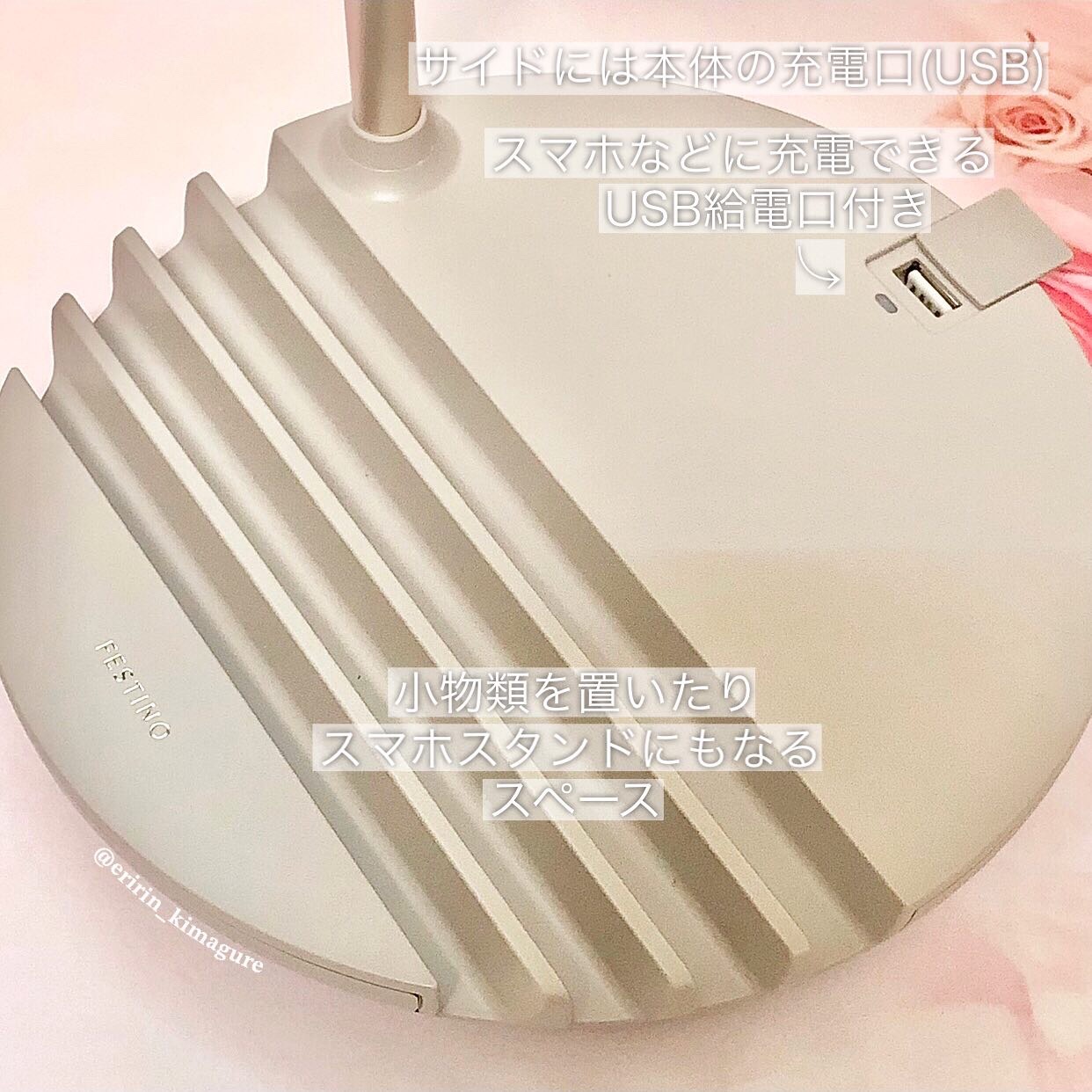 FESTINOの充電式LEDファンミラーこれ、めちゃ使い勝手が良くて一年半ほどずっと使っています!1.ミニ拡大鏡がついている→メイクの細かいところも大きくチェックしやすい2.土台に鏡やスマホが置ける→スマホでメイク動画見ながら鏡見やすいあと私...