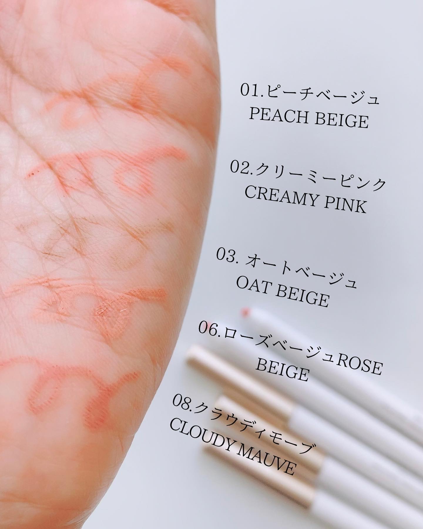 - < 01 ピーチベージュ> メチルトリメチコン、ポリプロピルシルセスキオキサン、合成ワックス、酸化チタン、マイカ、セレシン、酸化鉄、エチルヘキサン酸アルキル(C12-15)、シリカ、(アクリレーツ/アクリル酸ステアリル/メタクリル酸ジメチコン)コポリマー、トリイソステアリン酸ポリグリセリル-2、(VP/ヘキサデセン)コポリマー、キャンデリラロウ、ポリヒドロキシステアリン酸、ジメチコン、イソステアリン酸、パルミチン酸エチルヘキシル、ミリスチン酸イソプロピル、レシチン、ポリリシノレイン酸ポリグリセリル-3、カプリリルグリコール、カプリル酸グリセリル、トリエトキシカプリリルシラン <02 クリーミーピンク> メチルトリメチコン、ポリプロピルシルセスキオキサン、合成ワックス、酸化チタン、マイカ、セレシン、酸化鉄、エチルヘキサン酸アルキル(C12-15)、シリカ、(アクリレーツ/アクリル酸ステアリル/メタクリル酸ジメチコン)コポリマー、トリイソステアリン酸ポリグリセリル-2、(VP/ヘキサデセン)コポリマー、キャンデリラロウ、赤202、ポリヒドロキシステアリン酸、ジメチコン、イソステアリン酸、パルミチン酸エチルヘキシル、ミリスチン酸イソプロピル、レシチン、ポリリシノレイン酸ポリグリセリル-3、カプリリルグリコール、カプリル酸グリセリル、トリエトキシカプリリルシラン <03 オートベージュ> メチルトリメチコン、ポリプロピルシルセスキオキサン、合成ワックス、酸化チタン、マイカ、セレシン、酸化鉄、エチルヘキサン酸アルキル(C12-15)、シリカ、(アクリレーツ/アクリル酸ステアリル/メタクリル酸ジメチコン)コポリマー、トリイソステアリン酸ポリグリセリル-2、(VP/ヘキサデセン)コポリマー、キャンデリラロウ、ポリヒドロキシステアリン酸、ジメチコン、イソステアリン酸、パルミチン酸エチルヘキシル、ミリスチン酸イソプロピル、レシチン、ポリリシノレイン酸ポリグリセリル-3、カプリリルグリコール、カプリル酸グリセリル、トリエトキシカプリリルシラン <04 ストロベリーミルク> メチルトライメチコン、ポリプロピルシルセスキオキセイン、チタンジオキサイド(CI77891)、合成ワックス、マイカ(CI77019)、セレシン、C12-15アルキルエチルヘキサノエイト、シリカ、アクリレート/ステアリルアクリレート/ダイメチコンメタクリレートコポリマー、ポリグリセリル-2トライアイソステアレート、VP/ヘキサデセンコポリマー、カンデリラワックス、黄色5CIホリックシー、15CI(5, CI)、CI(H-2,202-He-598)、C I. 5、202.C <05 アプリコットコーラル> メチルトライメチコン、ポリプロピルシルセスキオクセイン、合成ワックス、チタンジオキサイド(CI77891)、マイカ(CI77019)、セレシン、C12-15アルキルエチルヘキサノエイト、黄色5号(CI15985)、シリカ、アクリレート/ステアリルアクリレート/ジメチコンメタクリレートコポリマー、ポリグリセリル-2トライアイソステアレート、ブイピー/ヘキサデセンコポリマー、ポリメラーゼ、CI201、ポリアキシド、ポリメロキシ、C,Cydelaxydelyd <06 ローズベージュ> メチルトリメチコン、ポリプロピルシルセスキオキサン、合成ワックス、酸化チタン、マイカ、セレシン、エチルヘキサン酸アルキル(C12-15)、酸化鉄、シリカ、(アクリレーツ/アクリル酸ステアリル/メタクリル酸ジメチコン)コポリマー、トリイソステアリン酸ポリグリセリル-2、(VP/ヘキサデセン)コポリマー、キャンデリラロウ、赤201、ポリヒドロキシステアリン酸、ジメチコン、イソステアリン酸、パルミチン酸エチルヘキシル、ミリスチン酸イソプロピル、レシチン、ポリリシノレイン酸ポリグリセリル-3、カプリリルグリコール、カプリル酸グリセリル、トリエトキシカプリリルシラン <07 ドライローズ> メチルトリメチコン、ポリプロピルシルセスキオキサン、合成ワックス、酸化チタン、マイカ、セレシン、エチルヘキサン酸アルキル(C12-15)、酸化鉄、シリカ、(アクリレーツ/アクリル酸ステアリル/メタクリル酸ジメチコン)コポリマー、トリイソステアリン酸ポリグリセリル-2、(VP/ヘキサデセン)コポリマー、キャンデリラロウ、黄5、ポリヒドロキシステアリン酸、赤202、ジメチコン、イソステアリン酸、パルミチン酸エチルヘキシル、ミリスチン酸イソプロピル、レシチン、ポリリシノレイン酸ポリグリセリル-3、カプリリルグリコール、カプリル酸グリセリル、トリエトキシカプリリルシラン <08 クラウディーモーブ> メチルトリメチコン、ポリプロピルシルセスキオキサン、合成ワックス、酸化チタン、マイカ、セレシン、酸化鉄、エチルヘキサン酸アルキル(C12-15)、シリカ、(アクリレーツ/アクリル酸ステアリル/メタクリル酸ジメチコン)コポリマー、トリイソステアリン酸ポリグリセリル-2、(VP/ヘキサデセン)コポリマー、キャンデリラロウ、ポリヒドロキシステアリン酸、青1、赤202、ジメチコン、イソステアリン酸、パルミチン酸エチルヘキシル、ミリスチン酸イソプロピル、レシチン、ポリリシノ