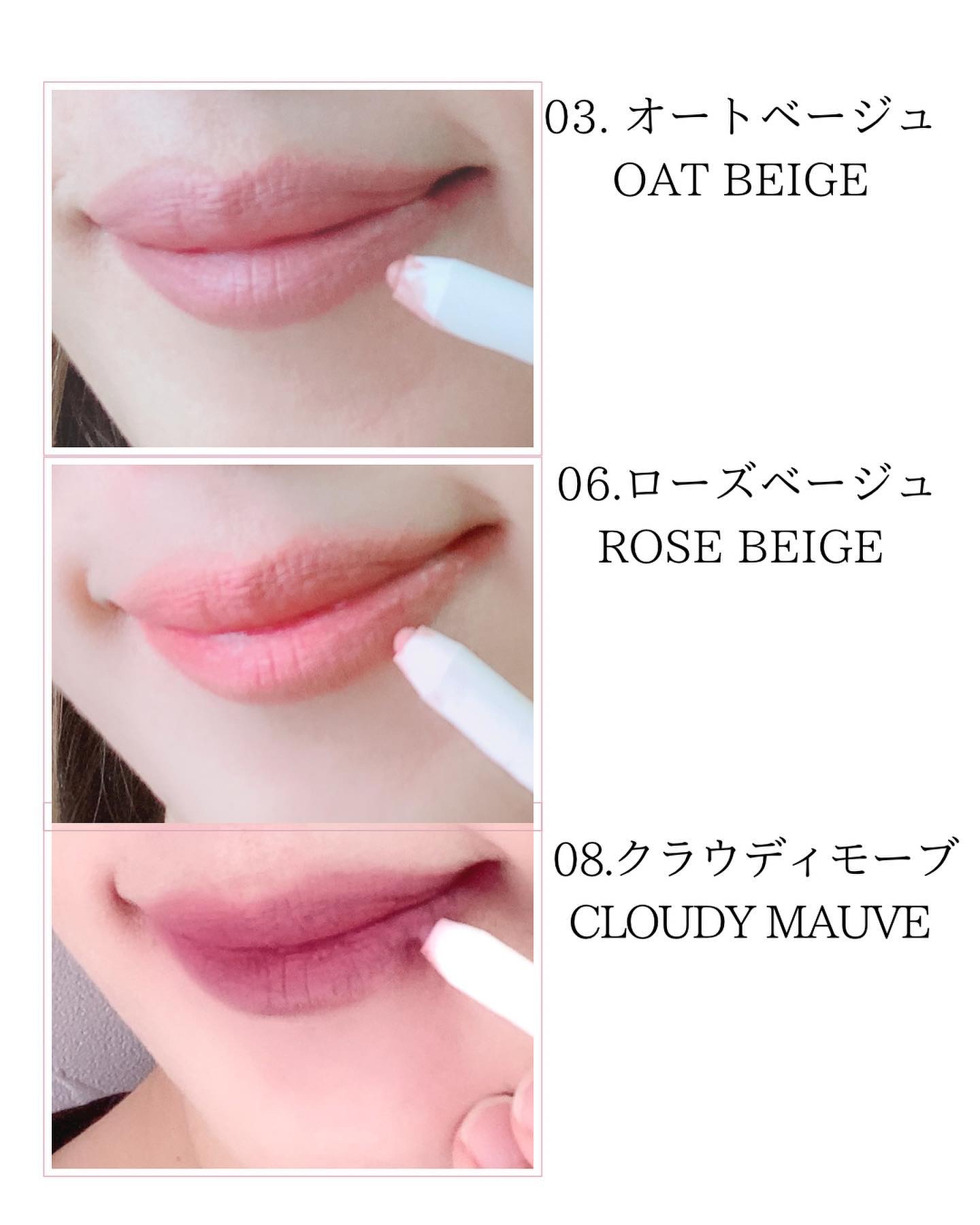 オーバーリップ気味に描くと人中も短くなる効果もあるんだって🥰 4つの機能を合わせ持つ4in1タイプ マットな仕上がりでしっとりと落ち着く色味のため浮く事もなかったです✨ どの色も肌に馴染みやすいから明るめと、暗めの2本を持つのをおすすめします♡ リップなどの他にもアイメイク使える色味を合わせることでメイクに統一感がでます✨