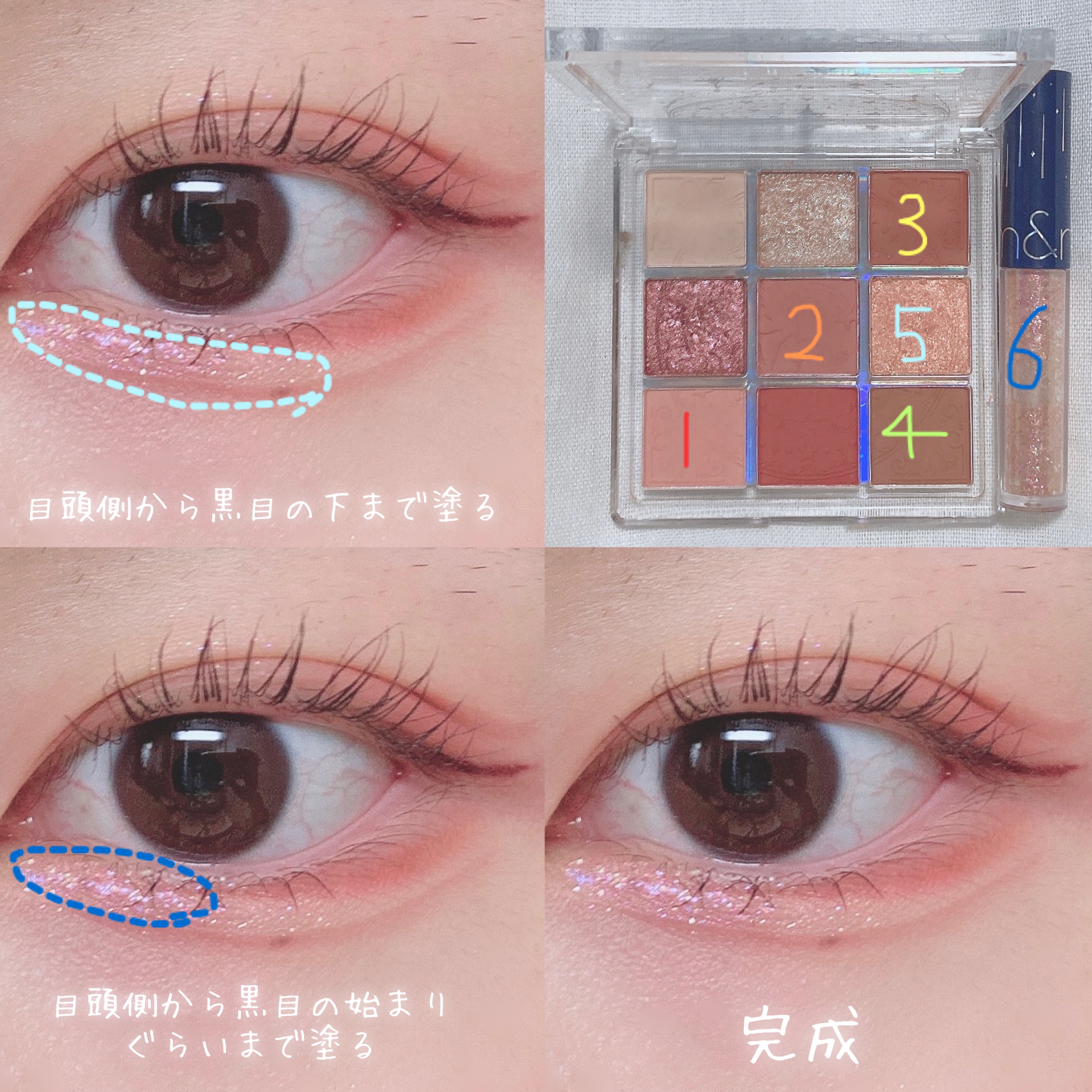 今回はキラキラで盛りつつふんわりとした印象にしたかったので以下のことを意識しました! ・ふんわりとした印象にするために締め色はメインカラーと混ぜて使う ・アイシャドウは塗りすぎ注意!少しはたいてから塗ると濃くなりにくいです ・涙袋はぷっくりに見せるために最初に締め色とメインカラーを混ぜて涙袋の影を下書きとして軽く描いておく ・ウルウルな目にしたかったので黒目の下のまつ毛の隙間にグリッターを軽く塗る ・アイラインはペンシルタイプでプラム系カラーを使い、メインカラーと締め色を混ぜアイラインをボカすとフワッとした印象になる