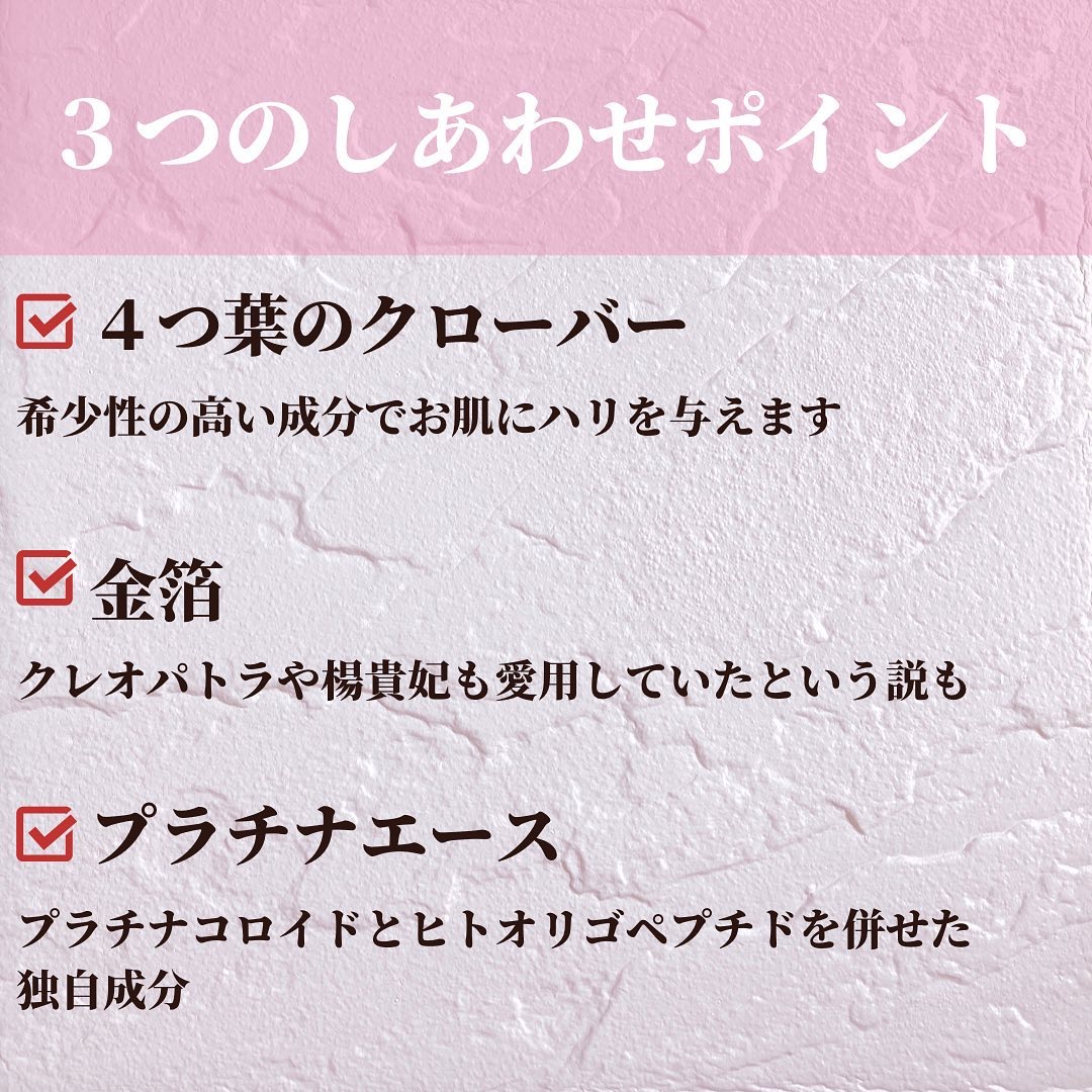 - オールインワンジェル『しあわせ想い』は、幸せのシンボルである四つ葉のクローバーから作られた成分*や、金沢産の高級金箔を配合。時短・美・幸運と、高品質スキンケア化粧品でありながら【縁起物】としての要素をプラスした、すっぴん笑顔が輝くスキンケア化粧品です。また3D形状記憶ジェル**によりお肌にハリを与え、高い弾力性を発揮。さらに独自処方成分により角質層への保湿成分の浸透力をサポートします。 *シロツメクサエキス(保湿成分) **形状を変化させても元の状態に戻るジェル