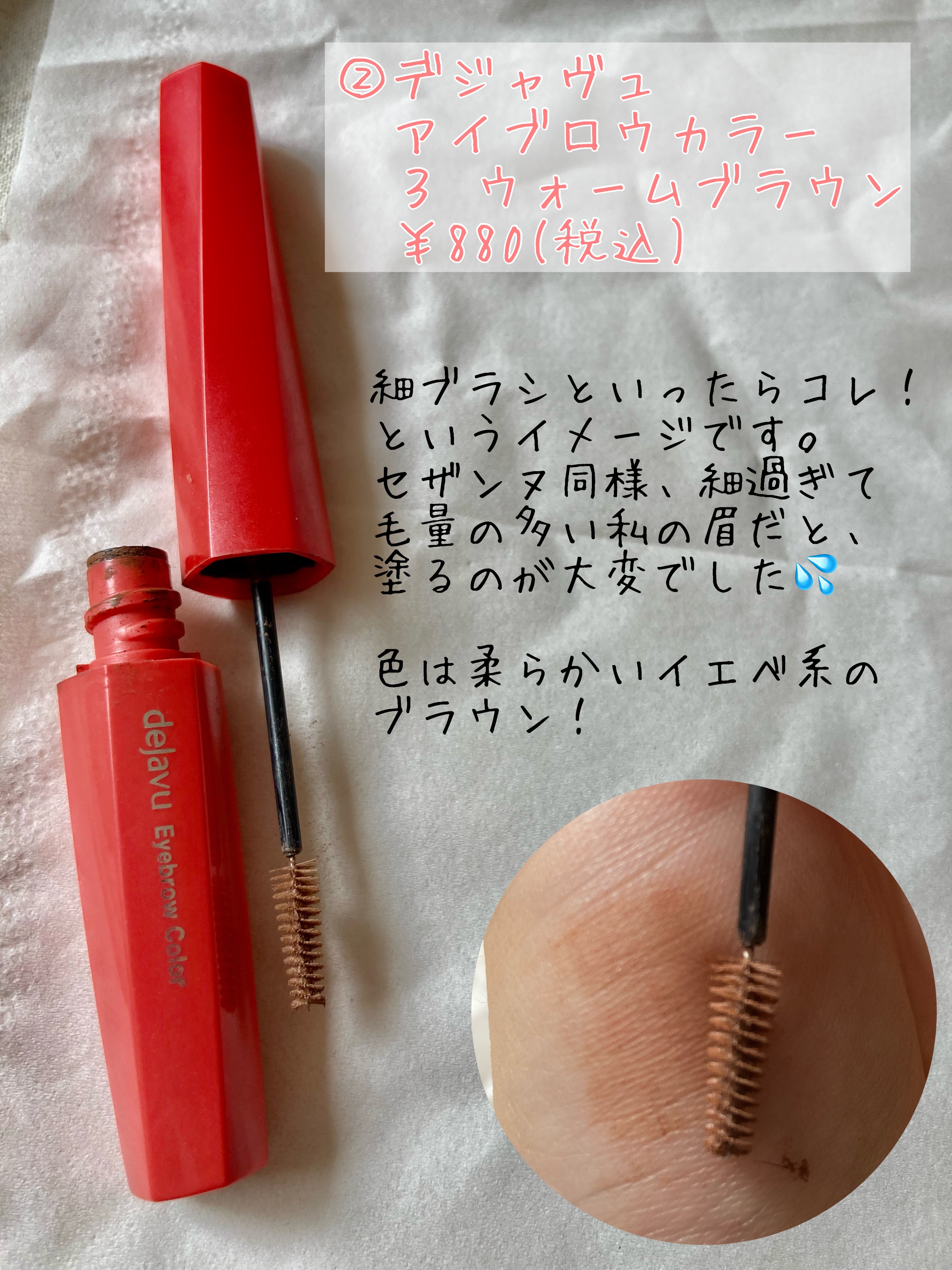 ずっと気になってたセザンヌの眉マスカラ。細ブラシは、細かいところが塗れていいと思っていましたが、しっかり塗るには何度も重ねないと行けないので、逆に濃くなる気がしました💦 細ブラシの代表格ってイメージ!セザンヌ同様、細ブラシは私のような濃い眉の人には合わないかもって思いました💦 初めて使ったのですが、塗りやすくてビックリ❗️ ひし形っぽい珍しい形のブラシが、太めだからひと塗りでしっかり抜けるけど、短めだからベタつかない! 今後これはリピートするかもしれません💡 1番リピートしている眉マスカラ!カラーバリエーションも豊富で、眉マスカラの代表格ってイメージです。太めブラシなので、さっと塗るだけでしっかり染まってくれます!ただ、その分、塗り過ぎには注意です⚠️