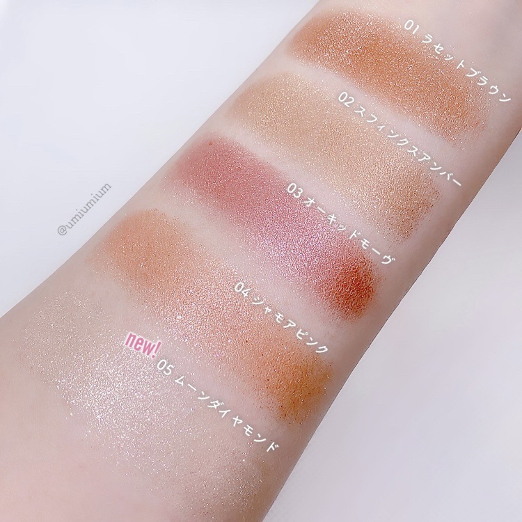 - <01 ラセットブラウン> タルク、ホホバ種子油、リンゴ酸ジイソステアリル、ジメチコン、ワセリン、(HDI/トリメチロールヘキシルラクトン)クロスポリマー、1,2-ヘキサンジオール、メタクリル酸メチルクロスポリマー、シリカ、イソステアリン酸ソルビタン、トコフェロール、スクワラン、セラミドNP、水、ヒアルロン酸Na、メチルパラベン、BG、フェノキシエタノール、水溶性コラーゲン、エチルパラベン、マイカ、酸化鉄、合成フルオロフロゴパイト、ホウケイ酸(Ca/Al)、酸化チタン、酸化スズ <02 スフィンクスアンバー> タルク、ホホバ種子油、リンゴ酸ジイソステアリル、ジメチコン、ワセリン、(HDI/トリメチロールヘキシルラクトン)クロスポリマー、シリカ、1,2-ヘキサンジオール、メタクリル酸メチルクロスポリマー、イソステアリン酸ソルビタン、トコフェロール、スクワラン、セラミドNP、水、ヒアルロン酸Na、メチルパラベン、BG、フェノキシエタノール、水溶性コラーゲン、エチルパラベン、マイカ、ホウケイ酸(Ca/Al)、酸化鉄、合成フルオロフロゴパイト、酸化チタン、酸化スズ <03 オーキッドモーヴ> タルク、ホホバ種子油、リンゴ酸ジイソステアリル、ジメチコン、ワセリン、(HDI/トリメチロールヘキシルラクトン)クロスポリマー、1,2-ヘキサンジオール、メタクリル酸メチルクロスポリマー、シリカ、イソステアリン酸ソルビタン、トコフェロール、スクワラン、セラミドNP、水、ヒアルロン酸Na、メチルパラベン、BG、フェノキシエタノール、水溶性コラーゲン、エチルパラベン、合成フルオロフロゴパイト、ホウケイ酸(Ca/Al)、酸化鉄、グンジョウ、マイカ、酸化チタン、アルミナ、水酸化Al、赤226、酸化スズ <04 シャモアピンク> タルク、ホホバ種子油、リンゴ酸ジイソステアリル、ジメチコン、ワセリン、(HDI/トリメチロールヘキシルラクトン)クロスポリマー、1,2-ヘキサンジオール、メタクリル酸メチルクロスポリマー、シリカ、イソステアリン酸ソルビタン、トコフェロール、スクワラン、セラミドNP、水、ヒアルロン酸Na、メチルパラベン、BG、フェノキシエタノール、水溶性コラーゲン、エチルパラベン、マイカ、合成フルオロフロゴパイト、ホウケイ酸(Ca/Al)、酸化鉄、酸化チタン、酸化スズ