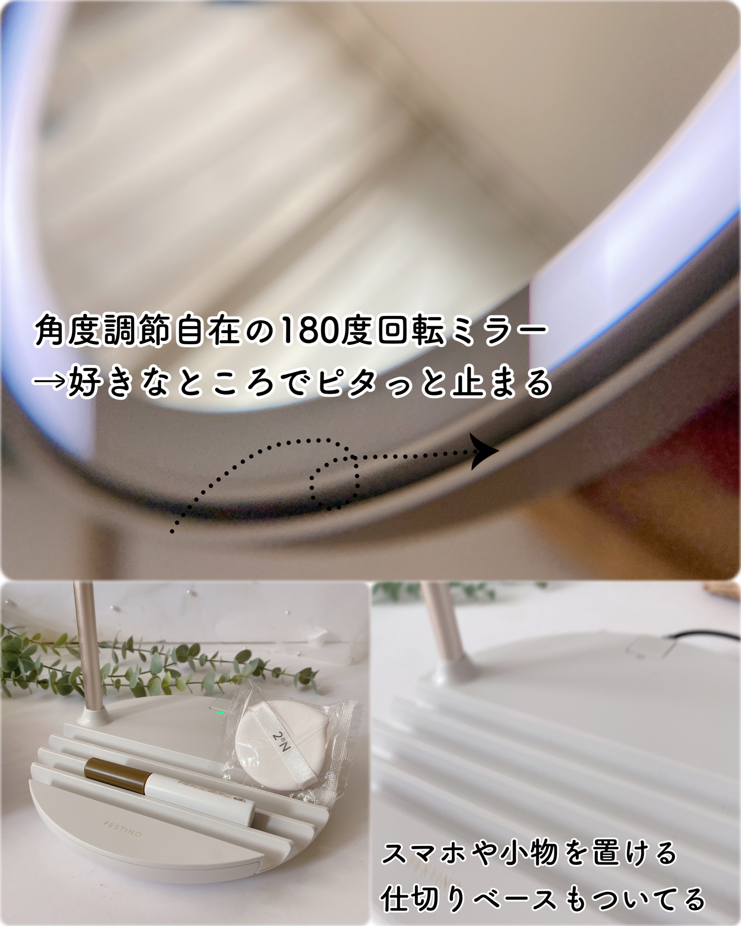 FESTINOの充電式LEDファンミラーこれ、めちゃ使い勝手が良くて一年半ほどずっと使っています!1.ミニ拡大鏡がついている→メイクの細かいところも大きくチェックしやすい2.土台に鏡やスマホが置ける→スマホでメイク動画見ながら鏡見やすいあと私...