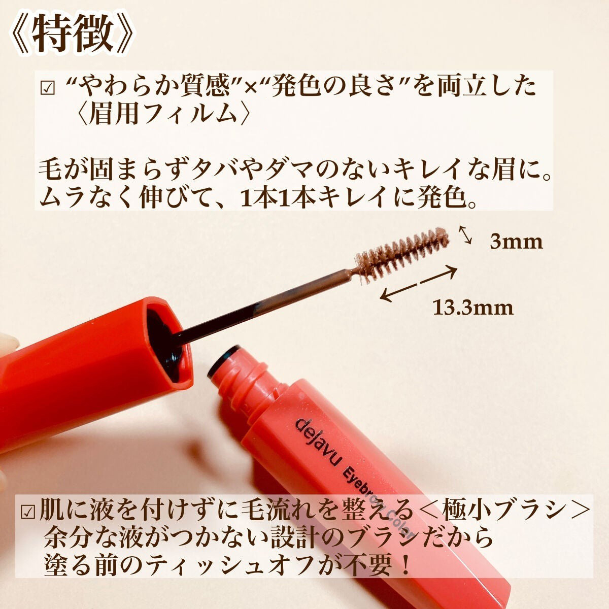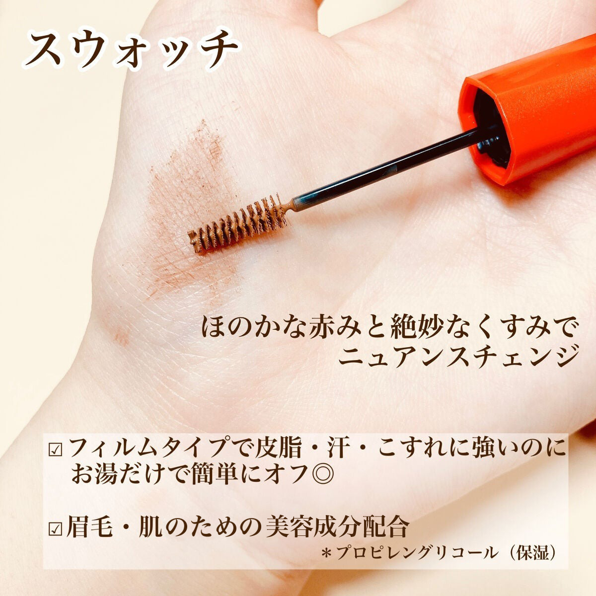 - \\25年3月定番新色モカグレージュ発売// 「フィルム眉カラー」なら眉の印象を自然にやわらげ、ふんわり質感の垢抜け眉に! 1.塗りやすい極小ブラシ ・ 先端直径3mmで、地肌に液がつきにくく根元から色づける ・余分な液がつかない設計で、ティッシュオフ不要 2.眉専用フィルム液 ・眉毛1本1本にキレイに色付き、自眉の黒さをやわらげる ・タバになったり、パリッと固まったりせず、まるで自眉のような仕上がり ・皮脂・汗・こすれに強いのにお湯で簡単オフ (※2025年9月以降、商品パッケージをリニューアル。)