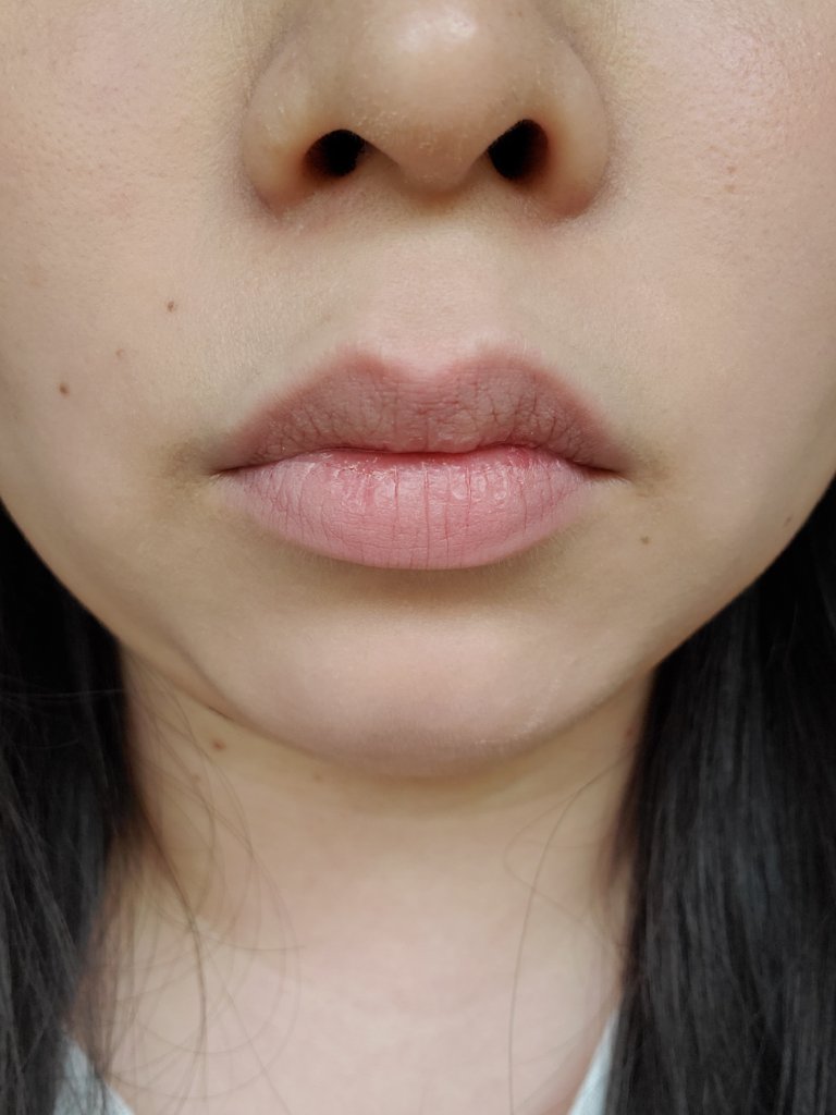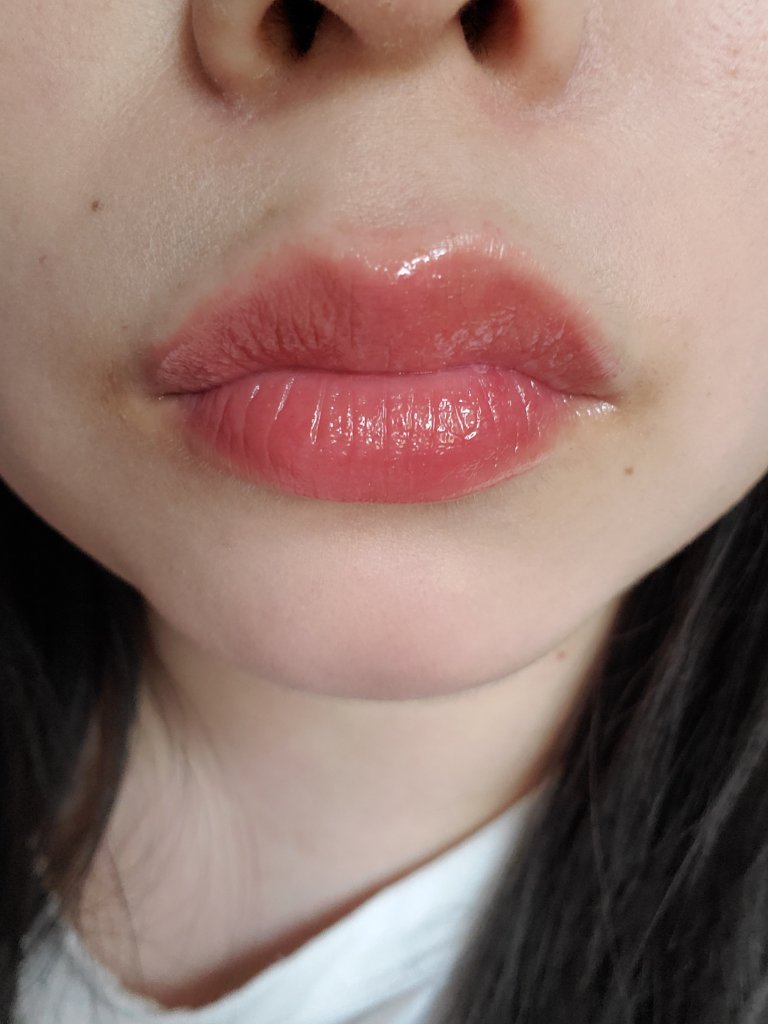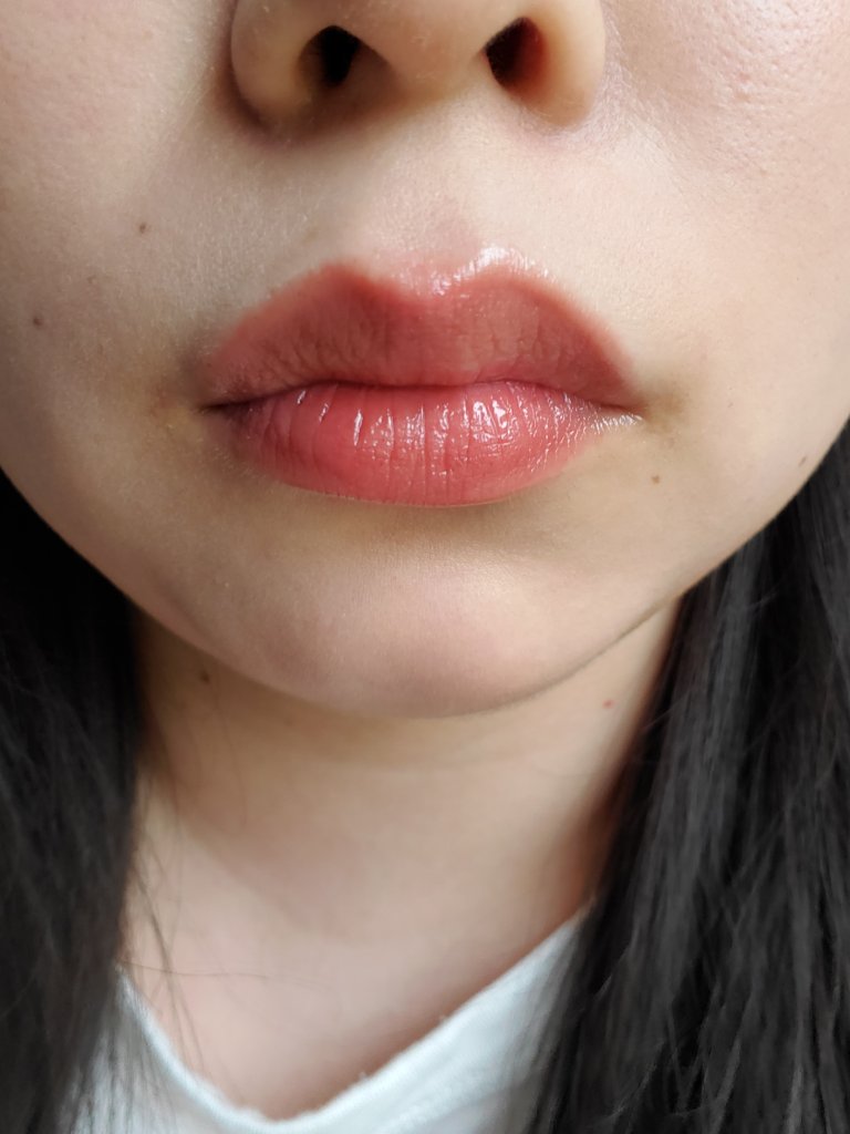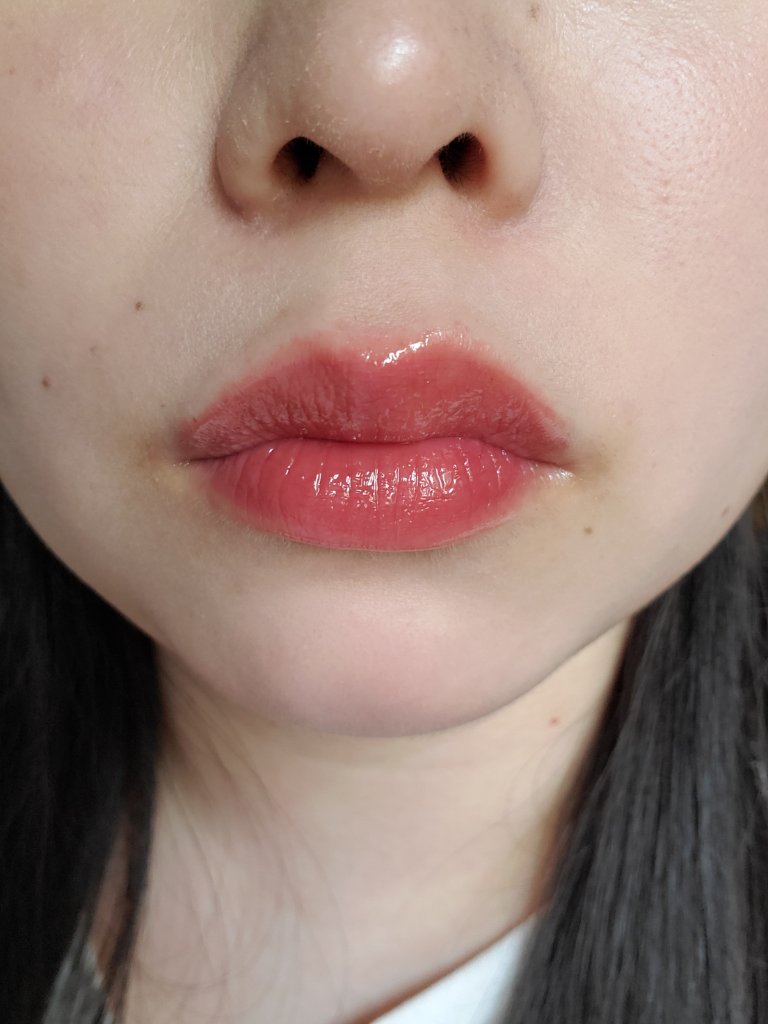 唇の温度で溶け出してスルスルと塗れます。唇に付いたときの粘度は高めで、ひと昔前のチューブタイプのグロスくらいの硬さ。 どちらも使いやす色味でツヤ唇に。粘度があるからかストローとかで飲み物を飲むくらいならすぐにはツヤは落ちない。 注意としては発色させてようと塗りすぎると唇閉じてから開いたときに、ねちゃあって糸引くから気を付けて😟