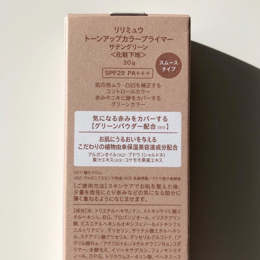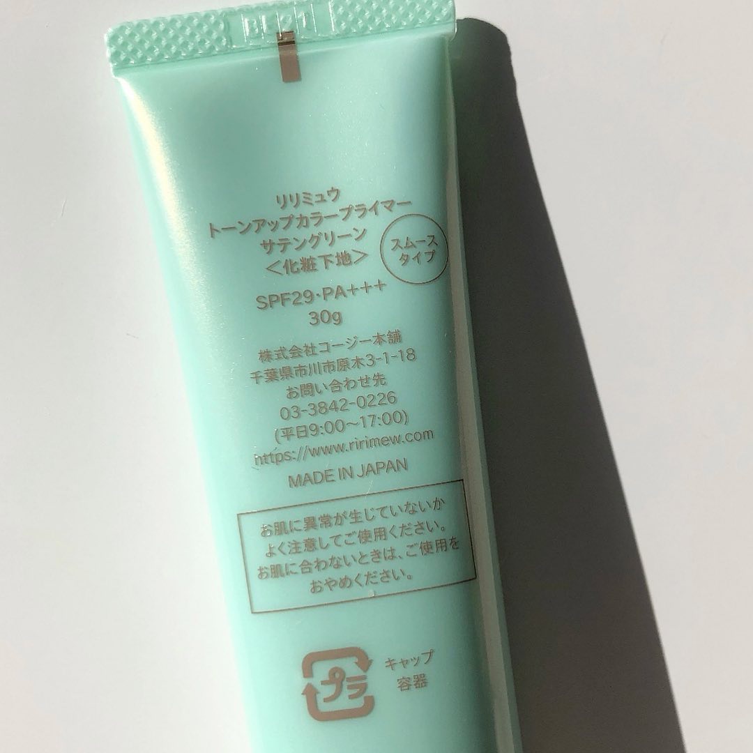 Ririmewトーンアップカラープライマー サテングリーン赤みを抑えたいときに良いグリーン下地💚赤みを抑えたいときはだいたい肌が敏感になってたり荒れてたりするときだから、石鹸でオフできるってとこが良い👍日焼け止め効果もキツすぎないから肌に負担...