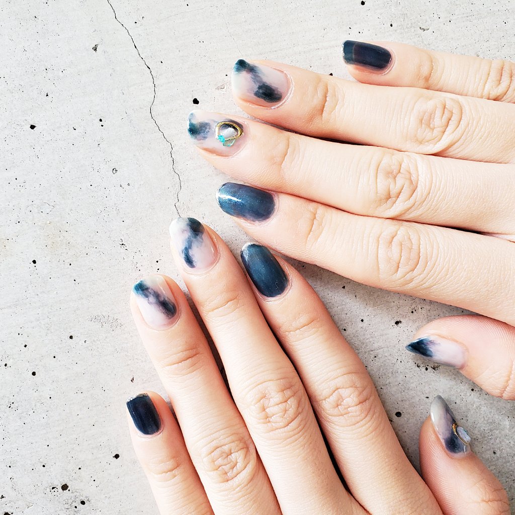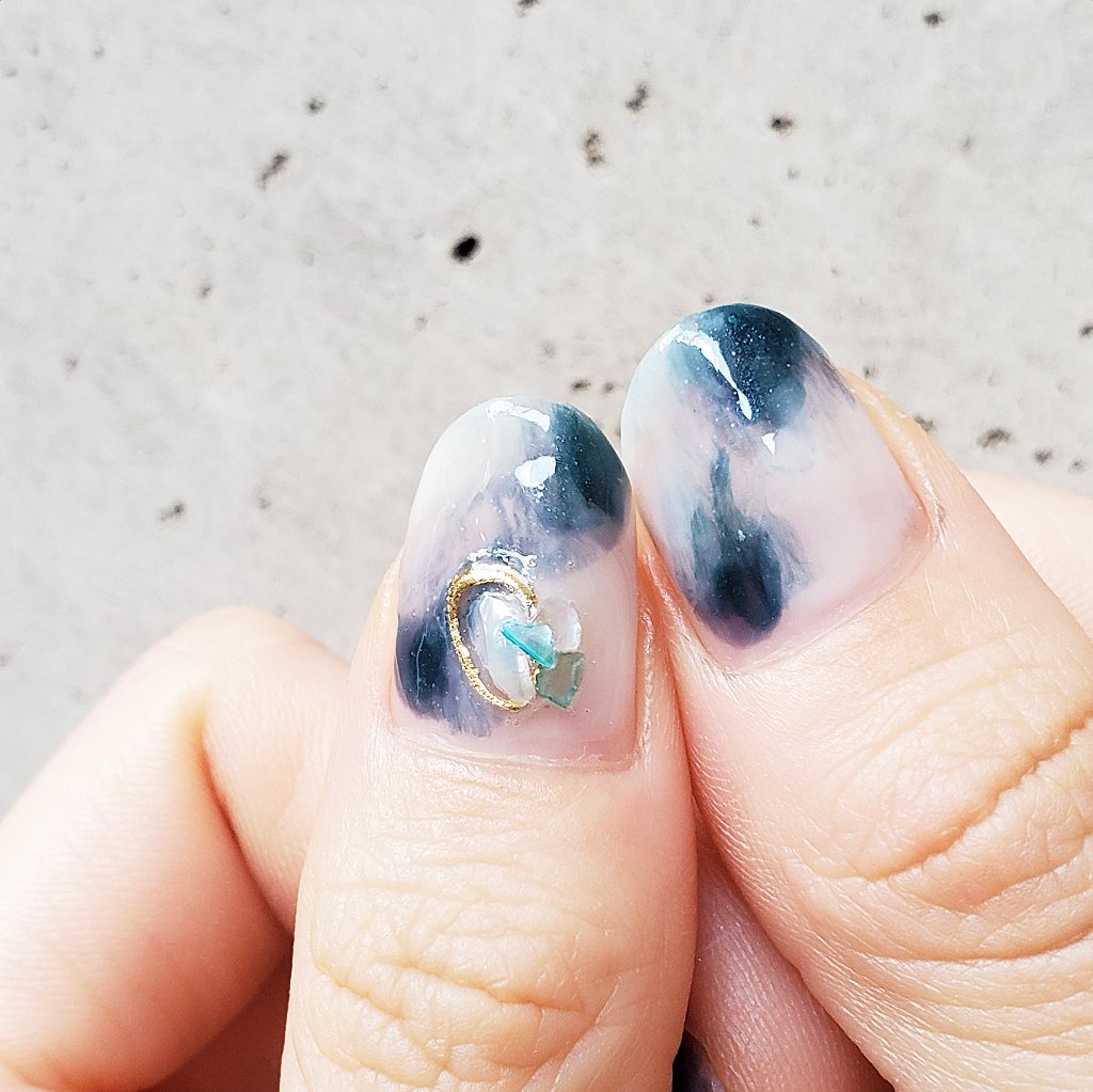 あおいろニュアンスネイル𓂃𓈒𓏸🩵💙⠀⠀☥親指・中指・薬指①iceveilをワンコート②運命の女神をポイント使い③MorningSnowを部分的に塗る④MIDNIGHTRAINを③にかかるように塗る⑤更にMorningSnowを重ねる⠀⠀☥人差...