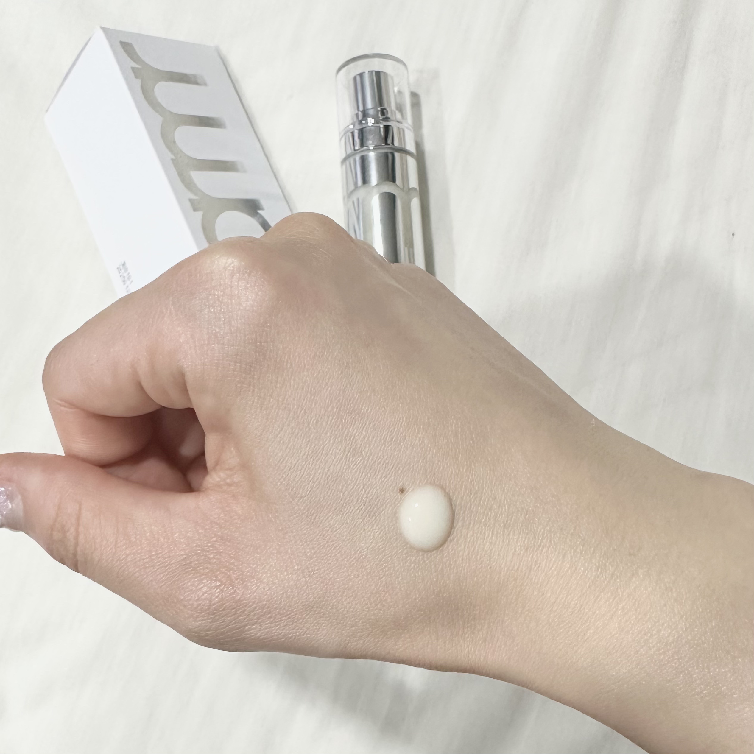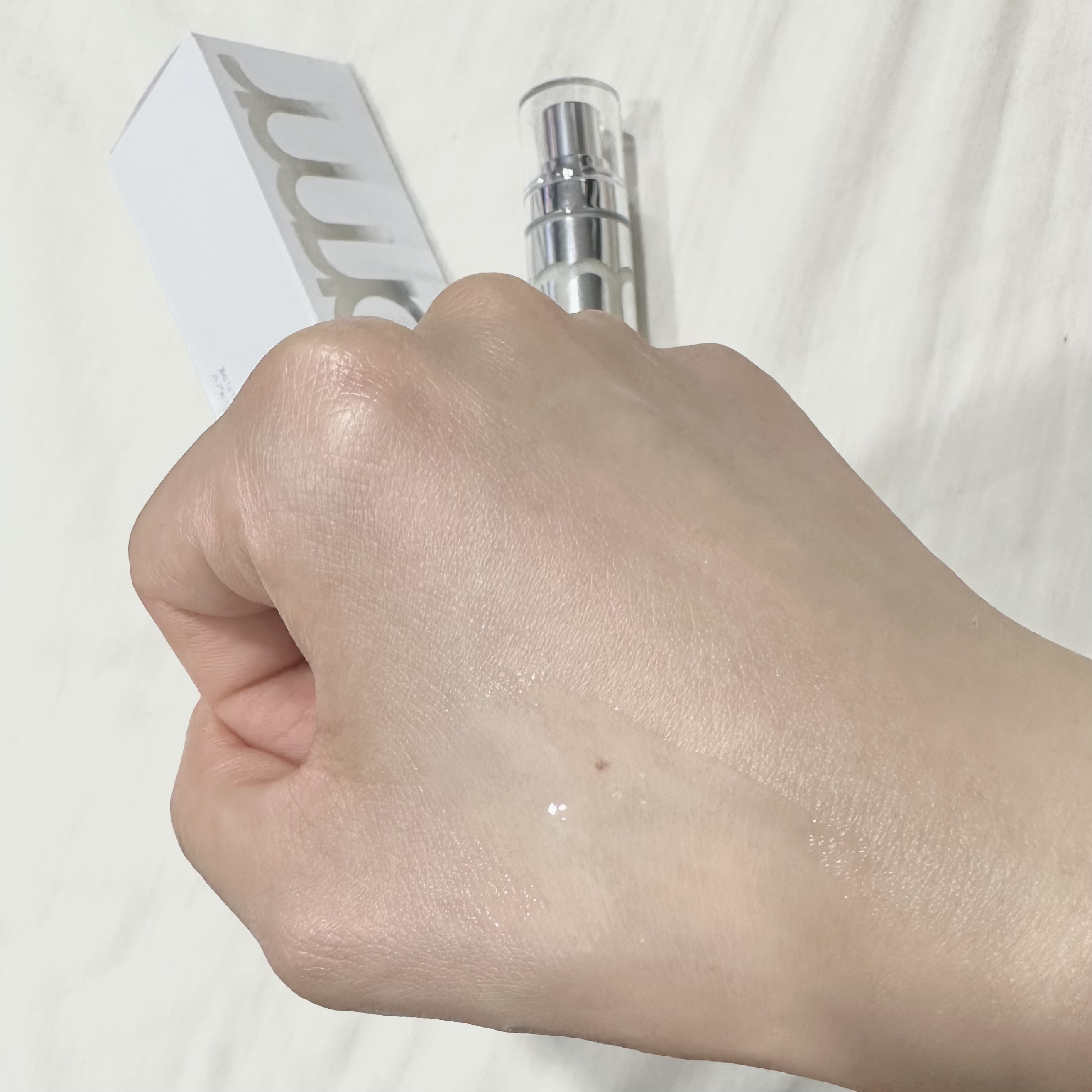サラッとしてるのにしっとりして乾燥はしません🫶🏻🫶🏻 SPF50+/PA++++で紫外線カット率も問題なしです☀️ 手の甲の青丸の部分に塗って見ましたが潤ってトーンアップした気がします💚