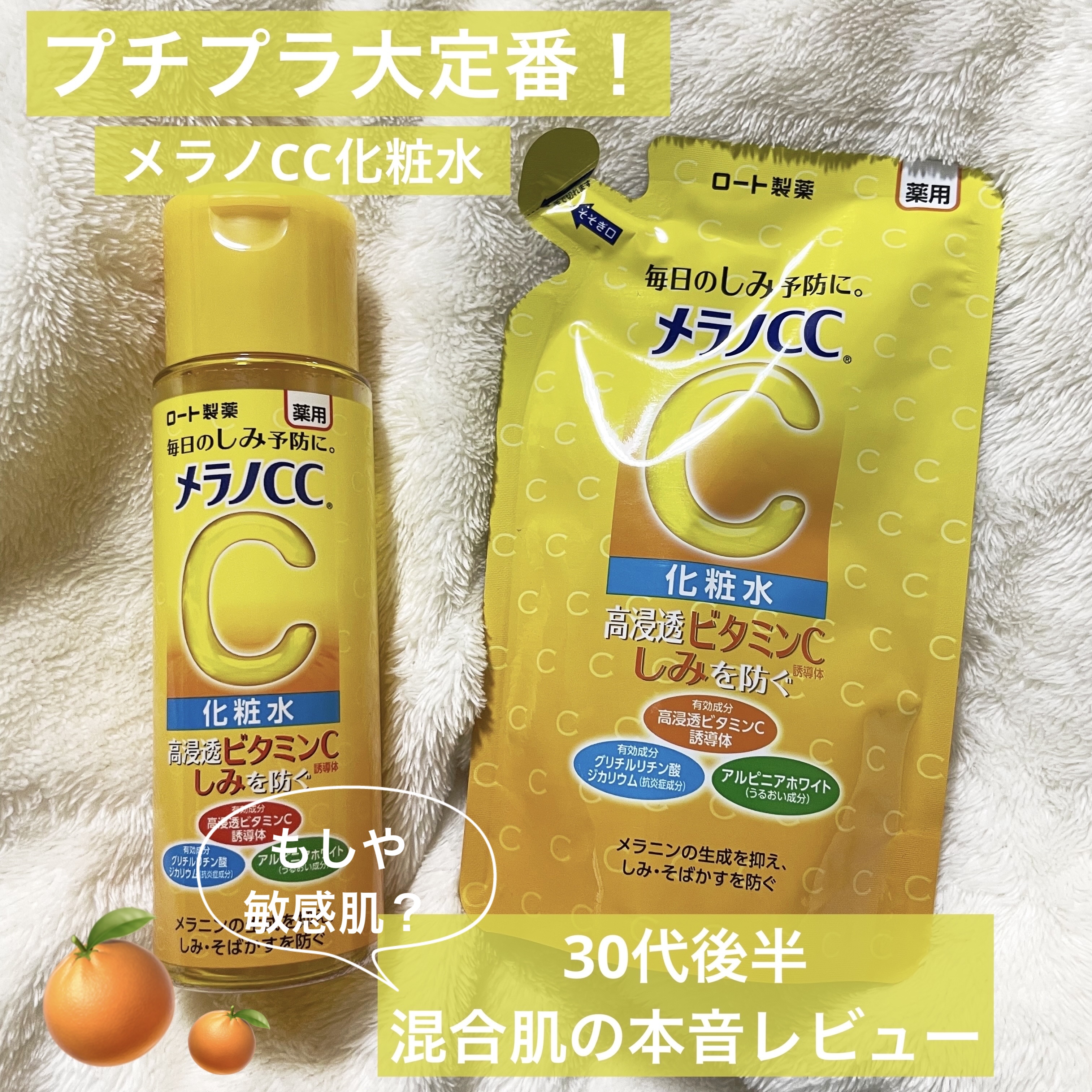 - 「メラノCC 薬用しみ対策 美白化粧水」は、顔全体にうるおいを与えながら、しみ対策できる薬用美白化粧水。 美白有効成分高浸透ビタミンC誘導体*1が角質層すみずみまで浸透し、メラニンの生成を抑え、しみ・そばかすを防ぎ、透明感のある肌へと導きます。 また、抗炎症成分*2と3種のうるおい成分*3を配合。ニキビ痕が気になる肌にもうるおいを与え、肌を整えます。 さわやかな柑橘系の香りです。 *1:3-O-エチルアスコルビン酸 *2:グリチルリチン酸ジカリウム *3:アルピニアホワイト、レモンエキス、グレープフルーツエキス