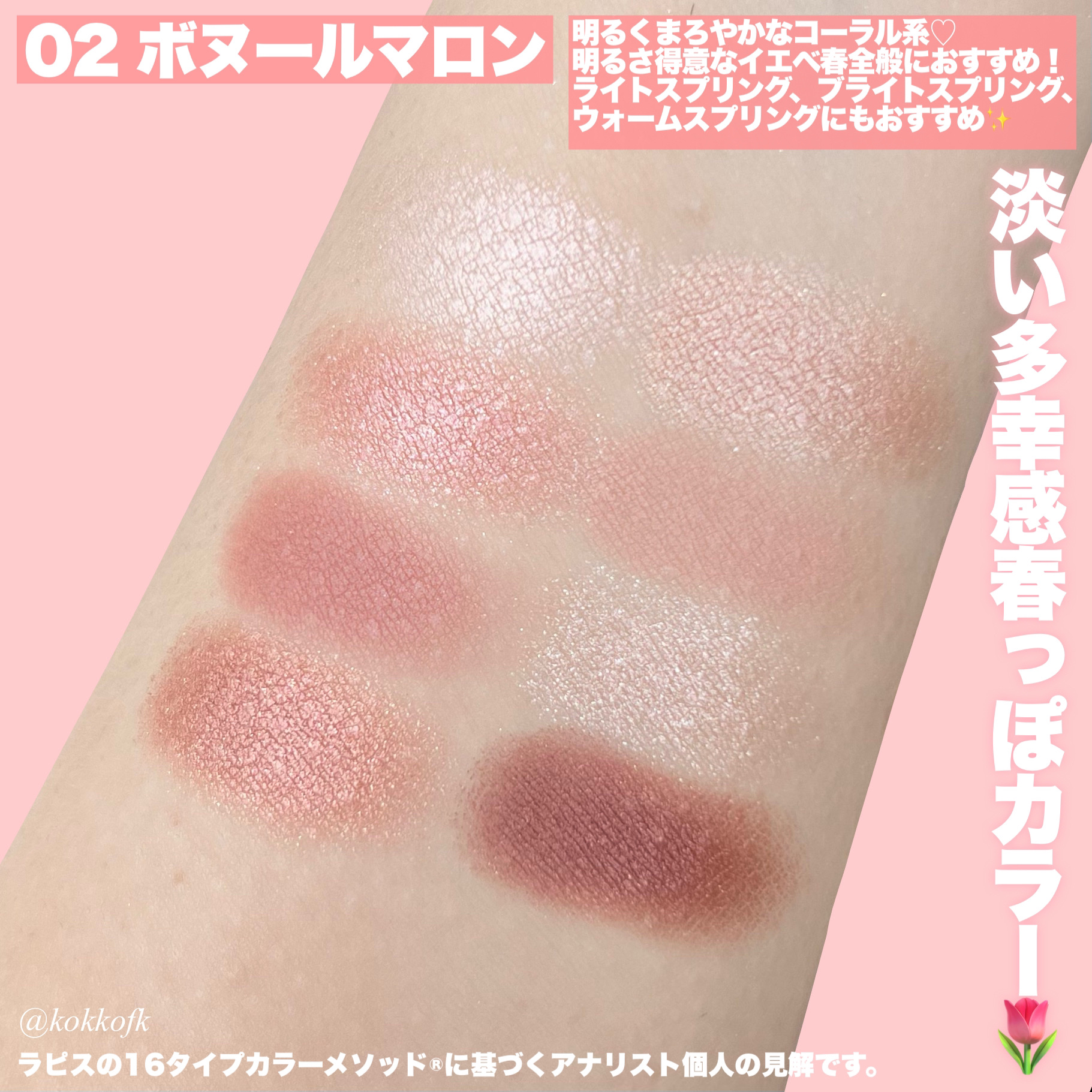 このバームはワセリンのようなとにかくうるうるの透明ツヤ感で、唇に負担なく薄づきの発色です💓 やや黄みの柔らかいヌードベージュ 明るさが得意なイエベ春におすすめ! 明るく澄んだ青みピンク 明るさが得意なブルベにおすすめ! やや黄みの澄んだコーラルレッド 2ndブルベのイエベ春におすすめ! 鮮やかで澄んだ青みレッド 鮮やかさが得意なブルベにおすすめ! 柔らかいくすみベージュブラウン 柔らかい色が得意なイエベにおすすめ! やや青みの柔らかいくすみレッド 柔らかい色が得意なブルベ夏に! しっかり青みのモーブピンク 1st2ndブルベにおすすめ!