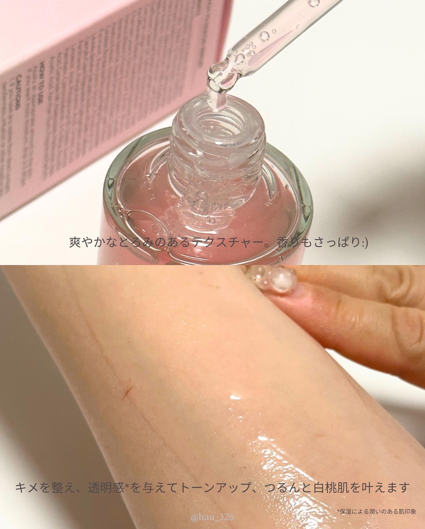 - 桃から抽出した自然由来成分、PEACHNIA(TM)を70%配合しており、たっぷり含まれるビタミン、ポリフェノール、タンニンなどの美容成分が肌を明るく輝かせます。さらに、肌の透明感を上げるナイアシンアミドを5%配合しており、シミ・そばかすの元となるメラニンが肌表面に露出することを阻害して透明感のある、クリアな肌へ。天然由来のやさしい成分が肌にダメージを与えることなく、肌のトーン、キメ、ツヤが美しく整った、つるんと白桃肌を叶えます。