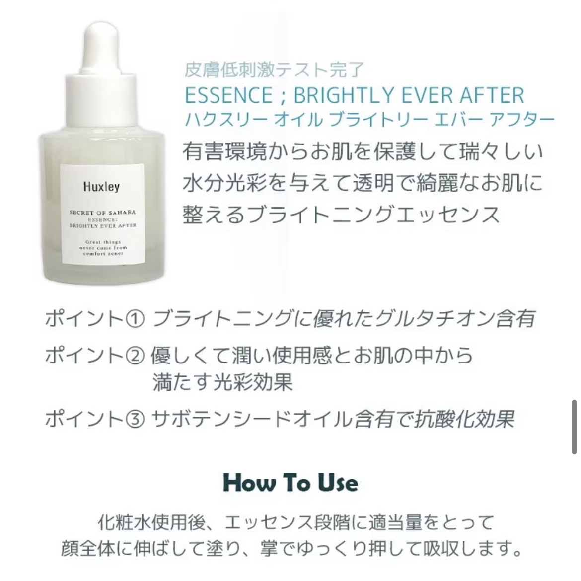- ハクスリーの提供するホワイトケアシリーズ。 グルタチオン配合の美容液と保湿クリームで、しっかりと潤いある透明感のある肌へ導き、肌をしっとり保護しながら、健康的な輝きを与えます。 内容: トナー;エクストラクトイット エッセンス;ブライトリーエバーアフター クリーム;グロウアウェイクニング
