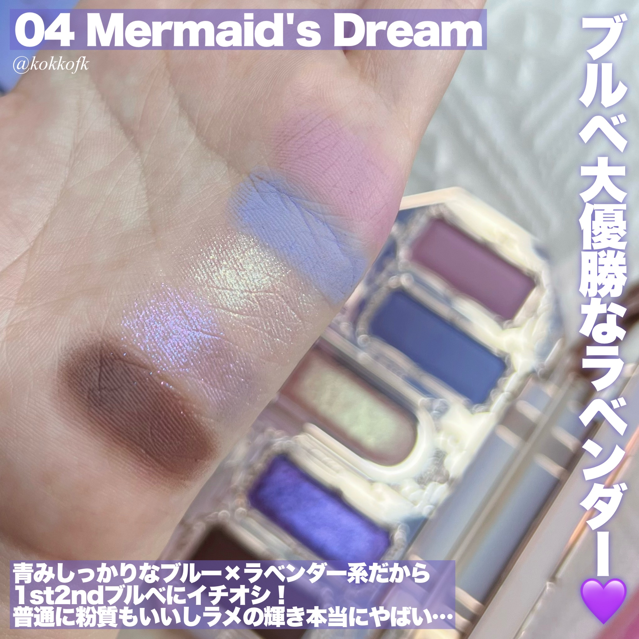 - 柔らかくサラっとしたマットと大粒ラメのグリッターカラーが目を引く、宝石箱をイメージしたパッケージデザインが豪華なアイシャドウパレット。使いやすいブラウン・ピンク系はもちろん、マーメイドをイメージしたパープルやブルーのカラー展開となっています。