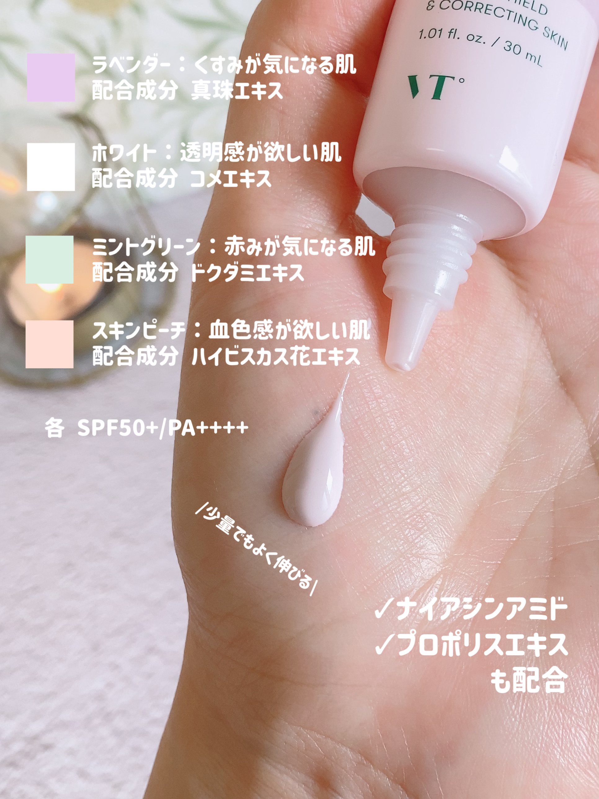 - <スキンピーチ> 水、アジピン酸ジブチル、プロパンジオール、カプリリルメチコン、エチルヘキシルトリアゾン、テレフタリリデンジカンフルスルホン酸、ナイアシンアミド、トロメタミン、ジエチルアミノヒドロキシベンゾイル安息香酸ヘキシル、ポリシリコーン-15、ジステアリン酸ポリグリセリル-3、ベンジルグリコール、セタノール、シリカ、ステアリルアルコール、イソステアリン酸ソルビタン、ビスエチルヘキシルオキシフェノールメトキシフェニルトリアジン、ステアロイルグルタミン酸Na、ベタイン、(アクリレーツ/アクリル酸アルキル(C10-30))クロスポリマー、カルボマー、ポリアクリル酸アルキル(C10-30)、パンテノール、キサンタンガム、エチルヘキシルグリセリン、BG、ツボクサエキス、クエン酸ステアリン酸グリセリル、アデノシン、水酸化Al、1,2-ヘキサンジオール、トリエトキシカプリリルシラン、ヒアルロン酸Na、グリセリン、ハイビスカス花エキス、ヒポファエラムノイデス果実エキス、加水分解ヒアルロン酸、プロポリスエキス、アセチルヒアルロン酸Na、アシアチコシド、トコフェロール、アシアチン酸、マデカシン酸、マデカッソシド、酸化チタン、酸化鉄(赤)、酸化鉄(黄)、乳酸メンチル、グルタチオン、香料 <ホワイト> 水、アジピン酸ジブチル、プロパンジオール、カプリリルメチコン、エチルヘキシルトリアゾン、テレフタリリデンジカンフルスルホン酸、ナイアシンアミド、トロメタミン、ジエチルアミノヒドロキシベンゾイル安息香酸ヘキシル、ポリシリコーン-15、ベンジルグリコール、ジステアリン酸ポリグリセリル-3、セタノール、シリカ、ステアリルアルコール、ビスエチルヘキシルオキシフェノールメトキシフェニルトリアジン、ステアロイルグルタミン酸Na、ベタイン、イソステアリン酸ソルビタン、(アクリレーツ/アクリル酸アルキル(C10-30))クロスポリマー、カルボマー、ポリアクリル酸アルキル(C10-30)、パンテノール、BG、キサンタンガム、エチルヘキシルグリセリン、ツボクサエキス、クエン酸ステアリン酸グリセリル、アデノシン、水酸化Al、1,2-ヘキサンジオール、トリエトキシカプリリルシラン、ヒアルロン酸Na、コメエキス、ヒポファエラムノイデス果実エキス、加水分解ヒアルロン酸、プロポリスエキス、アセチルヒアルロン酸Na、アシアチコシド、トコフェロール、マデカシン酸、マデカッソシド、アシアチン酸、酸化チタン、酸化鉄(黄)、乳酸メンチル、グルタチオン、香料 <ミント> 水、アジピン酸ジブチル、プロパンジオール、カプリリルメチコン、エチルヘキシルトリアゾン、テレフタリリデンジカンフルスルホン酸、ナイアシンアミド、トロメタミン、ポリシリコーン-15、ジエチルアミノヒドロキシベンゾイル安息香酸ヘキシル、ジステアリン酸ポリグリセリル-3、ベンジルグリコール、セタノール、ステアリルアルコール、イソステアリン酸ソルビタン、ビスエチルヘキシルオキシフェノールメトキシフェニルトリアジン、ステアロイルグルタミン酸Na、ベタイン、シリカ、(アクリレーツ/アクリル酸アルキル(C10-30))クロスポリマー、カルボマー、ポリアクリル酸アルキル(C10-30)、パンテノール、BG、キサンタンガム、エチルヘキシルグリセリン、ツボクサエキス、クエン酸ステアリン酸グリセリル、アデノシン、水酸化Al、1,2-ヘキサンジオール、トリエトキシカプリリルシラン、ヒアルロン酸Na、ドクダミエキス、ヒポファエラムノイデス果実エキス、加水分解ヒアルロン酸、プロポリスエキス、アセチルヒアルロン酸Na、アシアチコシド、トコフェロール、マデカシン酸、マデカッソシド、アシアチン酸、酸化チタン、酸化クロム、乳酸メンチル、グルタチオン、香料 <ラベンダー> 水、アジピン酸ジブチル、プロパンジオール、カプリリルメチコン、エチルヘキシルトリアゾン、テレフタリリデンジカンフルスルホン酸、ナイアシンアミド、トロメタミン、ジエチルアミノヒドロキシベンゾイル安息香酸ヘキシル、ポリシリコーン-15、ベンジルグリコール、ジステアリン酸ポリグリセリル-3、セタノール、ステアリルアルコール、イソステアリン酸ソルビタン、ビスエチルヘキシルオキシフェノールメトキシフェニルトリアジン、ステアロイルグルタミン酸Na、ベタイン、シリカ、(アクリレーツ/アクリル酸アルキル(C10-30))クロスポリマー、カルボマー、ポリアクリル酸アルキル(C10-30)、パンテノール、キサンタンガム、エチルヘキシルグリセリン、BG、ツボクサエキス、クエン酸ステアリン酸グリセリル、アデノシン、1,2-ヘキサンジオール、水酸化Al、トリエトキシカプリリルシラン、パールエキス、ヒアルロン酸Na、ヒポファエラムノイデス果実エキス、加水分解ヒアルロン酸、プロポリスエキス、アセチルヒアルロン酸Na、アシアチコシド、トコフェロール、マデカッソシド、アシアチン酸、マデカシン酸、酸化チタン、グンジョウ、酸化鉄(赤)、乳酸メンチル、グル