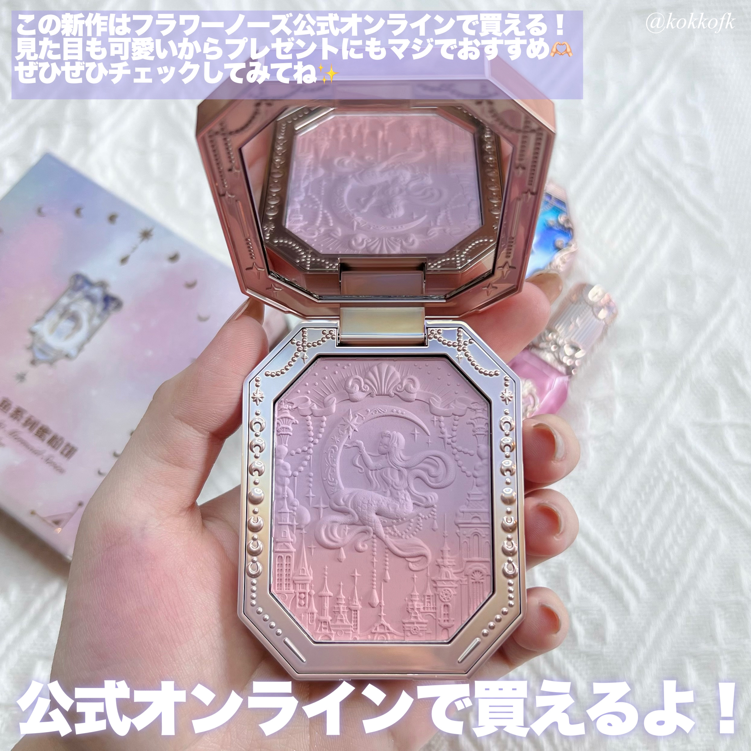 人魚のパッケージがかわいすぎるフラワーノーズのチークです!😭 パッケージに奥行きがあるのがずっと眺めてられます…… 中も模様が細かく施されていて、とても綺麗です…! グラデーションになっていて、上の方はラベンダーカラーで発色というより透明感を与えてくれる感じです🤲 透明感のあるピンクカラー、下の方はコーラルカラーで血色感を与えてくれます